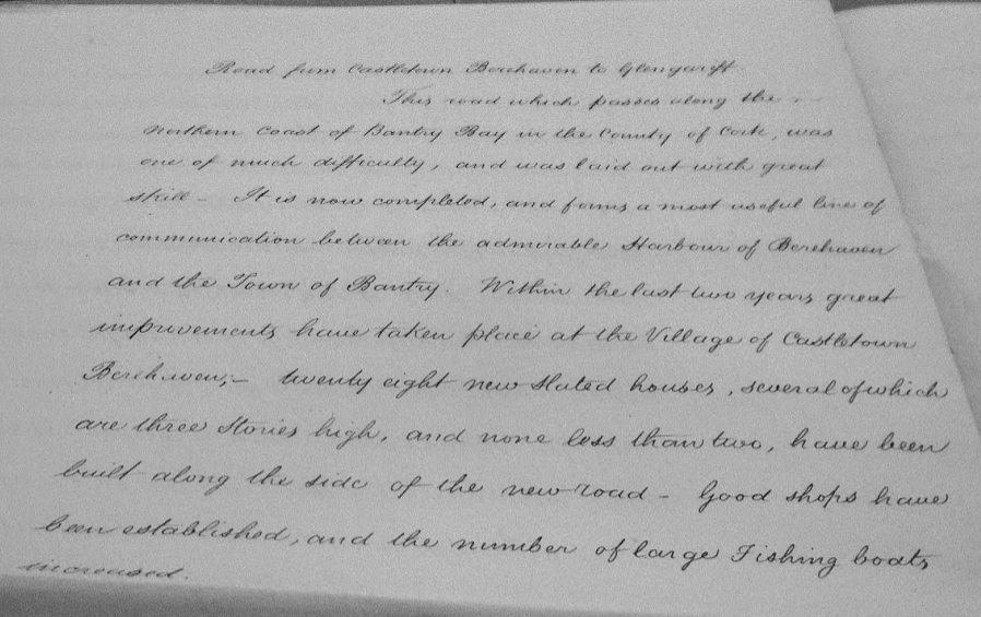 Continued here and elsewhere in Griffith’s reports is progress following the completion of the roads, new houses in Castletownbere, three story stone houses and larger fishing vessels. On the Mizen peninsula before the road no wheeled vehicles, there alos the only place in Ireland outside of Ulster he had poor Protestants labouring on the roads.