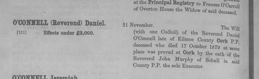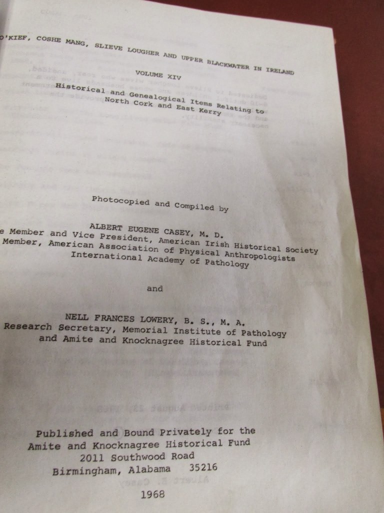 ndex to O’Kief, Coshe Mang – Cork materialVisit the page on Tracing your Cork Ancestors to see an introduction to O’Kief, Coshe Mang.A B C D E F G H I J K L M N O P Q R S T U V W X Y ZAdministration bonds: Index to 2,709 administration bonds in the diocese of Cloyne 1630-1857. Volume. 6. p.318-338.Administration bonds: Index to 8,250 administration bonds, diocese of Cork 1612-1858. Volume 6. p. 1102-1167Aghabullogue parish. Church of Ireland. Marriages 1808-1843. Volume 14, p. 497-502.Aghinagh. Tombstone inscriptions. Volume 8. p1808-1813.Aglish Roman Catholic parish. Macroom, Kilmurry & Aglish RC parishes. Marriages 1864-1866 & 1931-1947. Volume 14, p. 2631-2666Annals of Ireland. Excerpts and notes relating to Southwest Ireland – three fragments by Dubhaltach Mac Firbisigh (translated by John O’Donovan) 615-908. Vol 11, p. 907-925Annals of the Four Masters translated by John O’Donovan. Volume 9Annals of the Four Masters. Excerpts from the Annals of the Four Masters relating to North Cork and East Kerry 1172-1580. Volume 4, p. 291-299.Anthropology: See Cork-Kerry Irish.Archives: Index to civil and church archives of Cork and Kerry. Volume.7, p. 2642-2659.Ardfert and Aghadoe. Index to wills in the diocese of Ardfert and Aghadoe, Church of Ireland, Cork and Kerry 1690-1858. Volume 5, p. 301-306.Atkins Family: Genealogy of the Atkins family of Firville. Volume 7, p. 1538.Ballinamona. Tombstone inscriptions. Volume 11, p. 1034-1205.Ballingeary. Tombstone inscriptions. Volume 6, p. 1852.Ballyclough .Tombstone inscriptions. Volume 8, p. 2098-2115.Ballydesmond (formerly Kingswilliamstown) – Baptisms in Ballydesmond 1833-1864. Volume 2, p. 133-200, 251-427, 484-515.Ballydesmond Roman Catholic parish. Marriages in the RC parish of Ballydesmond 1888-1900. Volume 11, p. 1206-1210.Ballydesmond. Notes on the emigration scheme from Ballydesmond, 1850 by Mrs Ellis. Volume 5, p. 500-503Ballydesmond. Tombstone inscriptions. Volume 6, p. 13313-1317.Ballyvourney Church. Baptisms at the RC church at Ballyvourney 1810-1868. Volume 11, p. 1316-1389.Ballyvourney memorial stone. A photograph of a memorial stone of the early Christian era circa 700 AD near Ballyvourney. Volume 6, p. 1338 (c).Ballyvourney. Tombstone inscriptions. Volume 6, p. 1871-72 & Volume 15, p. 462-479.Ballyvourney: See also Tithe Applotment Books.Banteer. Tombstone inscriptions. Vol 7, p. 2144-2180 & Volume 15, p. 462-479.Baronies. A map of the baronies in County Cork. Vol 11, p. 637aBarry family of Cork and Kerry. Vol 7, p. 1527-1533.Becher family of Hollybrook. Vol 7. p. 1534.Bernard family of Palace Anne – genealogy. Volume 7, p. 1534.Births, marriages and deaths and miscellaneous items abstracted from Kerry and Limerick newspapers 1749-1872. Volume 11Births, marriages and deaths taken from Cork (1753-1774 and 1782-1784) and Kerry (1828-1864) newspapers. Vol 6. p. 2064-2403.Births, marriages and deaths. Slieve Lougher and environs. North Cork & East Kerry. Deaths 1864-1900. Volume 15, p. 1-100.Births, marriages, deaths and miscellaneous events abstracted from Limerick newspapers et al 1781-1821. Volume 8, p. 2385-2500.Boherboy district. Register of deaths 1864-1900 (continued). Vol 2. p. 559-622.Boherboy district. Register of deaths 1864-1900 in the district of Boherboy (Boherbue) Co. Cork. Volume 1, p. 121-244, 277-418.Boherbue Church. Baptisms at Boherbue Church 1863-1900. Volume 11, p. 179-384.Boherbue Church. Baptisms at St Mary’s RC Church, Boherbue 1833-1864. Volume 2, p. 133-200, 251-427, 484-515.Boherbue Church. Marriage records 1903-1947. Volume 14, p. 341-365Boherbue Church. Marriage records of St Mary’s RC Church, Boherbue 1863-1870. Volume 3 p. 56-72.Boherbue Church. Marriages at Boherbue. 1863-1900. Volume 11, p. 1212-1245.Boherbue: See also: O’Sullivan family; Forde family.Boherbue: Tombstone inscriptions. Volume 1365-1370.Book of Rights (Leabhar na gCeart). Cork & Kerry items from the Book of Rights with notes by John O’Donovan. Volume 8, 2157-2205.Boyle, Richard, Sir. (Great Earl of Cork). Excerpts from the Lismore papers (autobiographical notes, remembrances and diaries of Sir Richard Boyle, first Earl of Cork.) edited by Rev. A.B. Grosart. Vol 4. 1632-1637 in OKCM Volume 5, p. 495-500.; Vol 1 1611-1620 in OKCM Volume 6. p. 339-385; p. 1206-1256. Volume 3 in OKCM Volume 8, p. 1758-1807; Volume 5 in OKCM Volume 8, p. 2018-2064.Broder, David see Ó Bruadair, Daithí.Buckley family: The distribution of the surname Buckley in the Cork-Kerry border area. Volume 1, p. 203.Buttevant: Tombstone inscriptions. Volume 11, p. 1034-1205.Calendar of Inquisitions, Post Mortem, Co. of Cork 1585-1693. Volume 8, p. 1274-1283.Carew family. The Carew family of Cork, Waterford and Wexford. Volume 6, p. 2441.Carrigleamleary parish Church of Ireland. Marriages 1848-1871. Volume 14, p. 432.Casey family. Casey families of Cork & Kerry 1600-1900. Volume 5, p. 529-532.Casey family. The Casey family of Doonbeg, Lisheen, Kiskeam, South Carolina and Cloyne (1313-1364). Volume 6, p. 2491-2504.Casey family: Genealogies of the Casey families of Slieve Lougher 1659-1959. Volume 3, p. 647, 654-676; Volume 4, p. 202 & 433-442A.Castlemagner. Tombstone inscriptions. Volume 15, p. 462-479.Castlemagner: Tombstone inscriptions. Volume6, p. 1876-1886.Charleville: Tombstone inscriptins. Volume 11, p. 1034-1205.Churchtown: Tombstone inscriptions. Volume 11, p. 1034-1205.Claims: A list of claims as they are entered with the Trustees at Chichester House on College Green, Dublin, before 10 August 1700. Volume 7, p. 1175-1208.Clerical Records: Clerical and parochial records of Cork, Cloyne and Ross, 1291-1860. Volume 6, p. 790-929.Clondrohid: Tombstone inscriptions. Volume 6, p. 1853-1860.Clonfert Tithe Applotment Books. Volume 8, p. 2017.Clonfert (Old graveyard). Tombstone inscriptions. Volume 15, p. 462-479Clonfert: Tombstone inscriptions. Volume 6, p. 1276-1282, 1292-1302.Clonmeen: Tombstone inscriptions. Volume 7, p. 2144-2180 & Volume 15, 