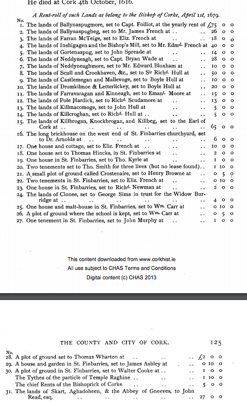In contrast those families granted estate, Beechers, Townsends or those like the Whites of Biantry or Bernards of Bandon who bought land cheaply early 18th century from the Hollow Blade Company did not fare as well. Few of the West Cork Landed families invested locally in productive assets. Even of the large estates the rentals were modest compared to the larger Irish estates. An exception would be Cox in the development of the Dunmanway linen industry or Addelry in Innishannon. The building of large houses, ostentatious lifestyles residences in Dublin and London ensued large debts and ultimately little disposable income. Papers such as the Chief Secretary are replete with Petitions from the West Cork Gentry for Government aid for road, harbour building various types of distress. However their individual personal contribution can characterised by the following during the cholera epidemic in 1833: