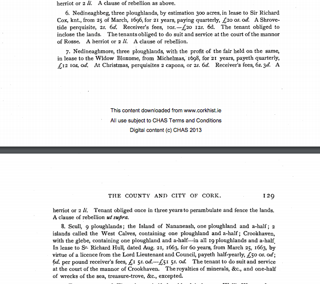 The section of deeds in the Bantry/Durrus shows the emergence of a class up to now invisible. They comprise Catholic and Protestant farmers of substance, merchants, Grand Jury road contractors who were in a position to advance loans to the local small Landlords such as the Blairs of Blairs Cove, Evansons of Durrus, Hutchinson of Clonee, Durrus. These are either by way of mortgage or rent charge. Ironically the advances commenced in the late 1780s a time of unparalleled prosperity when a well managed estate should have being doing well. It is estimated the land rent went up by a factor of 3 between 1780 and 1815 the dated of the Battle of Waterloo.