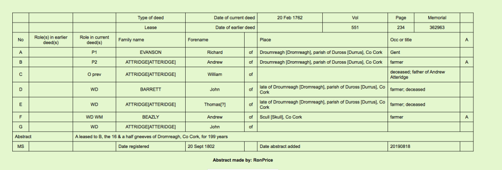 Timothy O’Donovan (1790-1874), 1818, O’Donovan’s Cove, in ruins 1875, Durrus, listed 1823, son of Richard Esq. and Jane d Alexander O’Donovan, Squince. 1820. Memorial to Lord Lieutenant by William Swanton, Gortnagrough, Ballydehob, West Cork. High Constable (Rate and Tax Collector), Barony of West Carbery For Relief on Losses Caused to Him in Banking Collapse when He had transmitted Due Amount to Co. Treasurer, Leslies, Stephen and Roches Bank, Supported by Lord Bantry and Magistrates Timothy O’Donovan (Durrus), William Hull (Schull), Richard Townsend (Skibbereen), Rev. Edward Jones Alcock (Durrus), Nathaniel Evanson (Durrus), Robert Kenny (Bantry). In 1823 he applied for relief of the poor of Ballydehob, which he had founded. Present at enquiry Skibbereen 1823 into enquiry into fatal affray at Castlehaven caused by Rev. Morritt’s tithe extraction. Correspondent with Antiquarian Dr. John O’Donovan re O’Donovans of Carbery. Brother of Dr O’Donovan and Richard O’Donovan J.P. and uncle of Richard O’Donovan J.P.. His son’s wife is the granddaughter of Daniel O’Connell, the mother of his wife was Miss Lavellan, Co. Limerick, a daughter of Philip Lavellin of Water Park in the Co. of Cork. Her sister was married to Mr. Puxley of Dunboy Branch. The grandson the present (1860) Mr. Puxley is a man of immense wealth the principal owner of the famous Allihies Mines in the Barony of Bere. Signed public declaration in Skibbereen to Alexander O’Driscoll on his removal as Magistrate 1835 with Lord Bantry, Simon White, John Puxley, Arthur Hutchins, Thomas Baldwin, Samuel Townsend Junior and Senior, Thomas Somerville, Richard Townsend Senior, Rev. Alleyn Evanson, Richard Townsend, Lyttleton Lyster. 1835 Subscriber Lewis Topographical Dictionary of Ireland 1837. In 1838 in the Liberal interest where at Bantry voter registration 15 were registered as opposed to 6 ‘Orangemen’ the tenants of Timothy O’Donovan J.P. were chiefly among those who registered. Among these were probably McCarthys of Tulig later prominent in Nationalist politics of whom John McCarthy (1859-1931) became a leading politician in Nebraska and wrote a poem in praise of Timothy O’Donovan. Attended Great Meeting in Bantry 1840 re Poor Laws. Chaired 1846 distress meeting Bantry on the proposition of Father Michael Barry PP Bantry. Landlord and political organiser. Member Election Committee, Rickard Deasy, Clonakilty (later Attorney General) 1855 Member election committee McCarthy Downing, Skibbereen. Juror Cork Spring Assizes 1863. Land record, 1870, Kate O’Donovan, O’Donovan’s Cove, 1,940 acres and Reps Timothy O’Donovan 1,940 acres. 1874, Death at 85 of Timothy O’Donovan, J.P., Esq, O’Donovan Cove, Durrus, West Cork, The Last Survivor of the Ancient House of O’Donovan Bawn or Clann Cahill, Justice of the Peace since 1818 Probate to daughter Mrs Anne Barry, widow, effects £2,000, attended 8, Grand Jury Presentments
