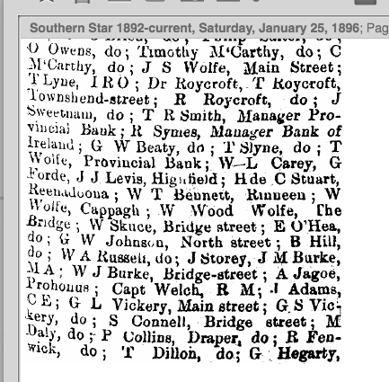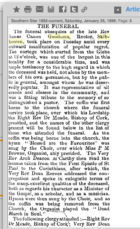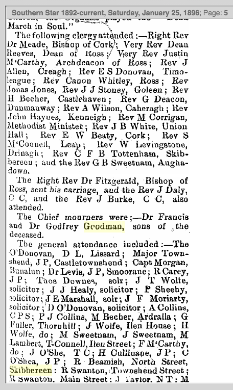 Funeral of Canon Goodman, as reported by Southern Star, Skibbereen, West Cork, 25th January 1896, listing attendance.