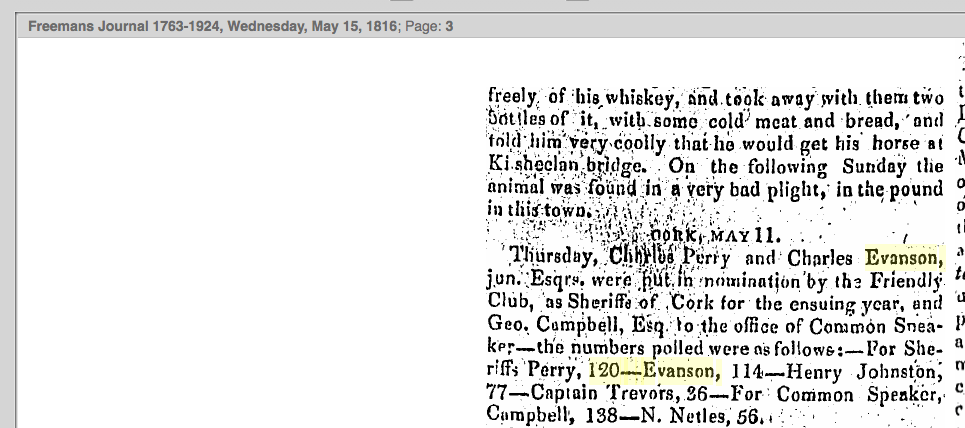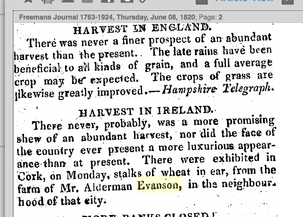 Alderman Charles Evanson Senior, 1793. Listed supporter of Act of Union, 1799. Died 1828 Charlemont, Douglas, son of Nathaniel Evanson, Durrus. Married Harriett Allen 1782, renting Ronaynes Court, Douglas from Christopher 1805. Sheriff 1793. Admitted his brother Nathaniel J.P., as Freeman of Cork on St. Valentine’s Day, 1794. Alderman, Sheriff and Mayor of Cork 1804. Named c 1800 in Quaker records as Church Warden, Christ Church Cork re extracting tithes. 1810 Alderman (Charles) Evanson, Trustee of fund to pay out to reduced Freemen, widows, orphans. His eldest son in 1811 Rev. William Alleyn married the sister of the Provost of TCD, Lyndon MacDonnell. Listed in tree register as having planted 1,100 trees in Durrus/Kilcrohane likely his 5 gneeves at Gurteneas Ahakista. Voted for Hutchinson 1826 election. 1824. Member Hanover Association meeting Cork 1791 re Whiteboys. Funded personally, Douglas in 1820 petitioned the Chief Secretary for more resources. Donor to two Catholic Churches 1826 including building of Rosnacaheragh Catholic Church, Durrus, died Ronaynes Court, August 1828. 1824. Letter from Charles Evanson, Cork, Co. Cork, to Sir Nicholas Colthurst, MP for Cork city, seeking to avail of his influence with the government to secure for his son, Reverend William S Evanson, preferment in the established church ‘either in London, Dublin, or elsewhere’. Emphasises his son’s talents and notes as a resident of the city of London at present, he has attracted the attention of ‘several distinguished Characters’. Continues ‘He is a zealous and hard working Labourer in the Vineyard of our Protestant Constitution’ and in the popular press has actively opposed the propaganda of the Catholic Association. Also alludes to the loss of employment of another son Charles Evanson Jr, who was removed from his office with the public coal yards [Dublin or Cork]. He also stresses his own very considerable financial commitments due to the presence of 9 children and a large extended family. [See also description CSO/RP/1824/1081].