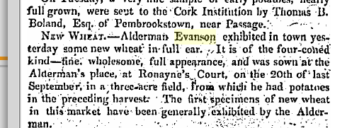 Charles Evanson Junior, 1827 son of Charles J.P., Lord Mayor Cork, Royayne’s Court, Douglas. 1818 late Sheriff, Cork. 1825 Director Cork Coalyard. Member 1832 Cork Friendly Club. Listed 1835. Thanked by Independent Liberal Electors for Impartiality in the 1835 elections. 1840 calling for Testimonial to late William Crawford Cork benefactor. In 1832 he was given a voting entitlement registered at Clonakilty for lands in Dromnea, Kilcrohane, by Nathaniel Evanson valued £20 freeholder at the time of query he was resident in Four Mile Water. In 1835 a rent charge of Durrus lands by Nathaniel Evanson entitling him to vote as £20 freeholder. Attending the 1840 Great Meeting Bantry re Poor Law. 1845 Member and Chairman Co. Assizes, Cork. Attending Famine Relief Meeting Dunmanway 1846. Presentment sessions Ballydehob 1845 address Charlemont. Skibbereen 1847 distress meeting. Assisting 1848 Henry J. Fawcett, Practical Instructor on Husbandry of Visit to Bantry. Cork Quarter Sessions 1856. His son Richard Charles Evanson, RM, Probate 1902 of Mrs. Henrietta Allen Coghlan, widow, Shanagrague, Co. Cork, to Richard retired RM, £624. 1856 passed into Military College Sandhurst, only son of Charles Evanson, J.P., Charlemont, Cork, ed Mr. Moynahan. listed 1842,1843, Son? Charles sitting Douglas 1850, voted 1850 for Denis Galwey as High Constable for Ibane and Ballyroe (Clonakilty). Estates in Douglas and 5 gneeves at Gurteneas, Ahakista sold Landed estates Court in Chancery 1849 and sold 1862. 1856 at the Military College, Sandhurst, four only out of 38 passed. Mr. RICHARD CHARLES EVANSON, of Charlemont, only son of CHARLES EVANSON, Esq., J.P., as one of the successful who passed with distinguished credit. He has been under tuition with Mr. T. Moynihan. Sitting Passage West, 1835,