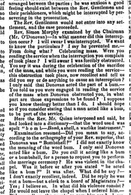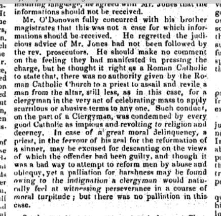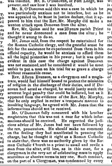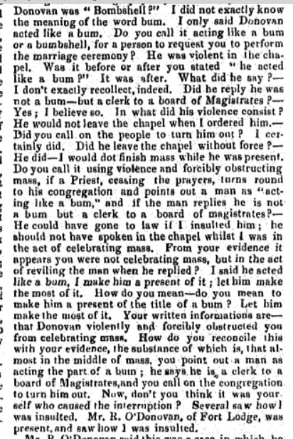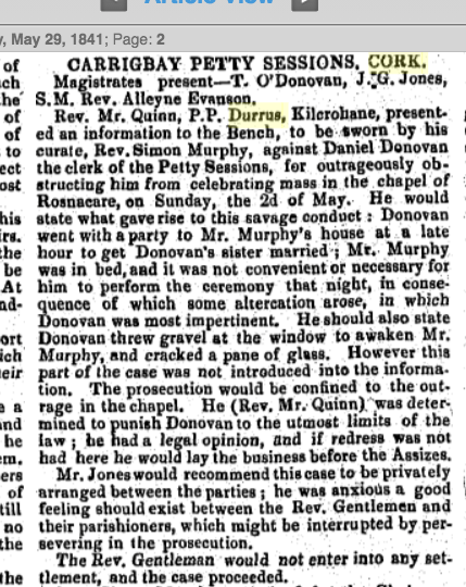 1841, Case at Carrigboy (Durrus ) Petty Session Court, Rev Simon Murphy, Curate, Rosnacaheragh, Daniel Donovan, Clerk Petty Session, Alleged that a Party of Donovan friends called to Father Murphys House late at Night to get Donovan’s sister, Married he refused. The Saga Continued…