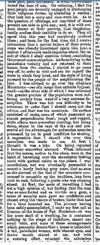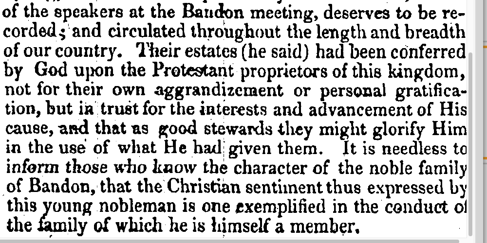 1843, Meetings for Protestant Orphan Society held by Reverend Edward Spring (Agressive Proselytiser) at Bandon, Clonakilty, Rosscarbery, Castletownsend, Glandore, Skibbereen, Ballydehob, Schull, Castletownbere, Dunmnway, Ballineen, Sermons at Durrus, Bantry. At Bandon Meeting Lord Bandon Sentiment ‘Deserved to be Recorded, Their Estates had Been Conferred by God upon the Protestant Proprietors of This Kingdom in Trust for The Advancement of His Cause