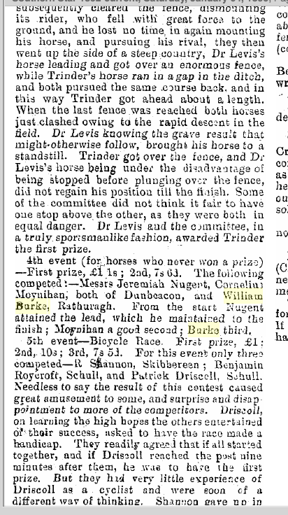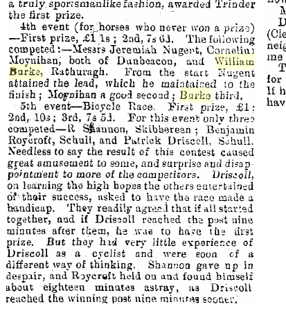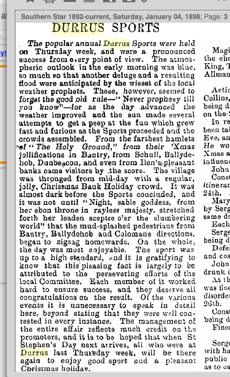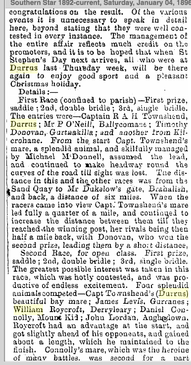 Held on New Year’s Day, cancelled due to the outbreak of Foot and Mouth disease in England in 1967. The Races are advertised as the ‘Durrus Races and Athletic Sports’ from the early 1890s. The 1895 races featured trotting matches, athletic sports, a steeplechase and a bicycle race and were held on Stephen’s Day. The Steeplechase was over Philip’s land in Rusheenaniska and included Dr Levis as a rider, he was noted horseman. The road race was from the Sand Quay to Mr Dulelow’s gate in Brahalish (Red Cliff) and back a distance of 6 miles. William Dukelow died returning from Durrus Races 26th December 1896. He had been walking around Coísín, near the bridge in Bahalish when he was struck by a man with a horse. At that time there was no wall and he fell into the sea. The family were searching for him. jack Dukelow, Brahalish He had a sidecar which the family did not use after his death. In earlier years he would have a horse racing at Durrus Races on Stephen’s Day. The same year in a case in Bantry in January 1926 it was stated that the Gardai in Durrus had drawn batons in an altercation after the Races and an action for assault against the gardai was thrown out by the Court and the offending persons were convicted of being drunk and disorderly. Political excitement was provided by a new political party ‘Clann Na Poblachta’. They campaigned for the 1948 election with an address after the Races on Stephens Day 1947. Shaun Dillon of Clashadoo had inherited licensed premises and house property from his aunts near the railway station in Bantry and for a period this was a centre of political gathering for the new party. Fine Gael started a branch in Durrus in 1947 under Timothy Hurley. Fianna Fail used the opportunity afforded by losing the election of February 1948 to regroup and Sean Lemass addressed an after Mass meeting in Durrus on the 29th May 1949.