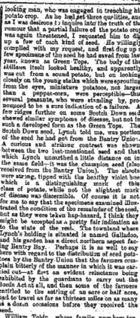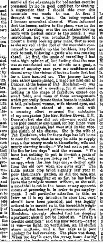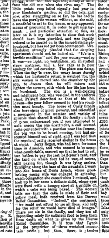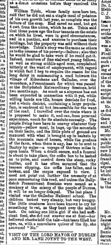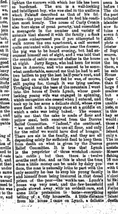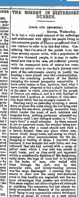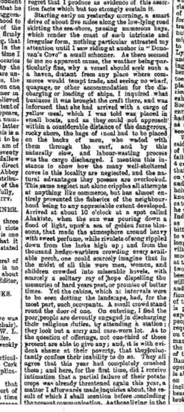1880 The Misery in Distressed Durrus, Yellow Meal Arriving by Schooner to O’Donovans Cove, off loaded by men on their bare back through the surf. Hungry Children at Gouladoo Natinal School. Only a Third Able to Give an Offering at the Stations. When a Death Occurs the Corpse is Lashed onto Poles and Carried down Steep Slopes. Cattle overnighting in Houses.