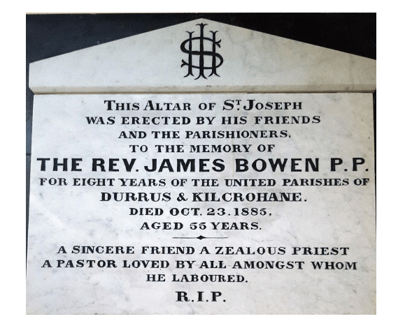 Rev James Bowen P.P. 5 July 1877-1885, there is a tablet in his memory in the church. An article in the Cor Examiner in April 1880 refers to him taking the reporter around the parish which was in widespread distress at the time. In 1880 lived at the former Evanson house at Ardogeena, Coolculaghta now occupied by Peter Gallagher. 1884 living at Blair’s cove. A branch of the Land League was set up in Durrus in January 1881 with Father Bowen in the chair. Also lived at Rawling’s house (Slated) Rossmore, Rawlings went bankrupt and later had a pub in Bantry and was a carman. Probate to brother William, farmer, Ballywilliam, Doneraile, £400.