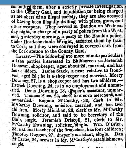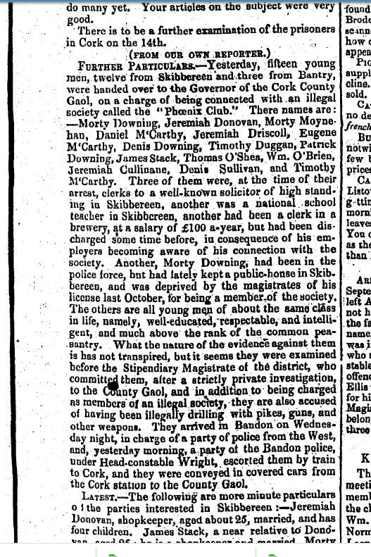 1858, Arrests of Men in Bantry and Skibbereen Allegedly Involved in Phoenix Society (Precourser to Fenians), 3 Coaches take the Skibbereen prisoners to Cork Jail. Immense Crowds Assemble and Loudly Cheered The Prisoner.