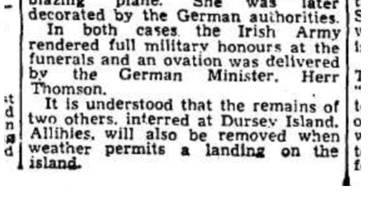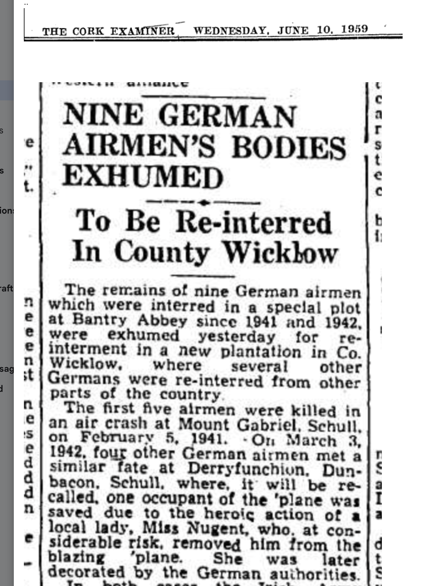 Those mentioned in the Paddy O’Keeffe, Bantry business man and historian commissioned an engineering survey in 1957. The Germans were reinterred I think in 1959. It is a beautiful graveyard with very humble stones laid flat. See enclosed. The true horror of war is shown in the numerous stones to a German Soldier or 2 or 3 or 4 names unknown. Quite a few from WW1. We are so lucky in Europe not to have had a major conflict since 1959. Even though it was opened in 1959 already some of the stones are difficult to make out due to erosion. By the way Colum Hourihane tells me that POK did photograph the air crash debris and I assume the photos are in the Cork Archive. Yes indeed- he labelled them and they were part of his war bundle! Colum