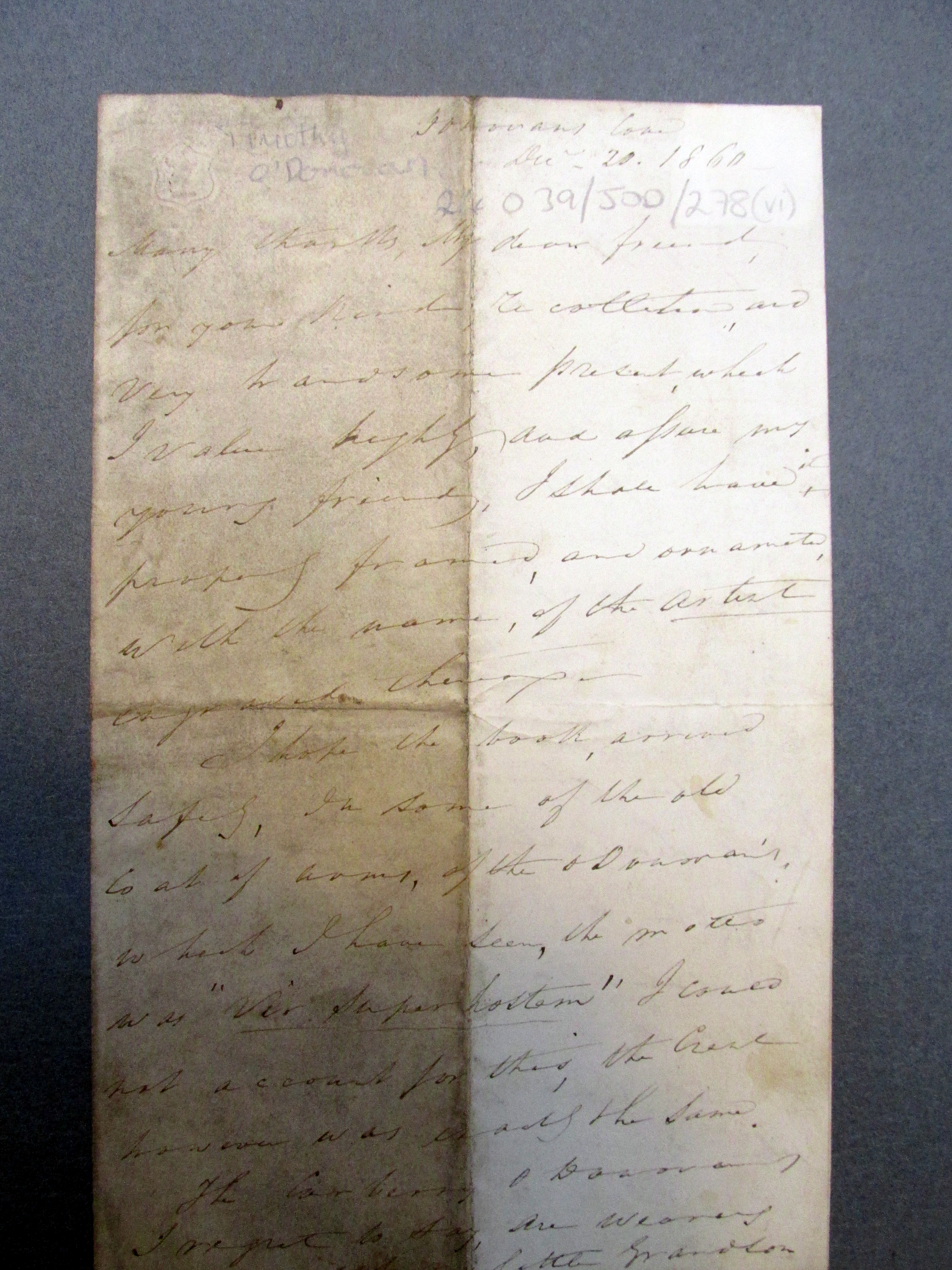 Many thanks my dear friend for your recent collection and very handsome present, which I value highly, and my young friend, I shall it have properly framed, and ornamented with name of the artist.