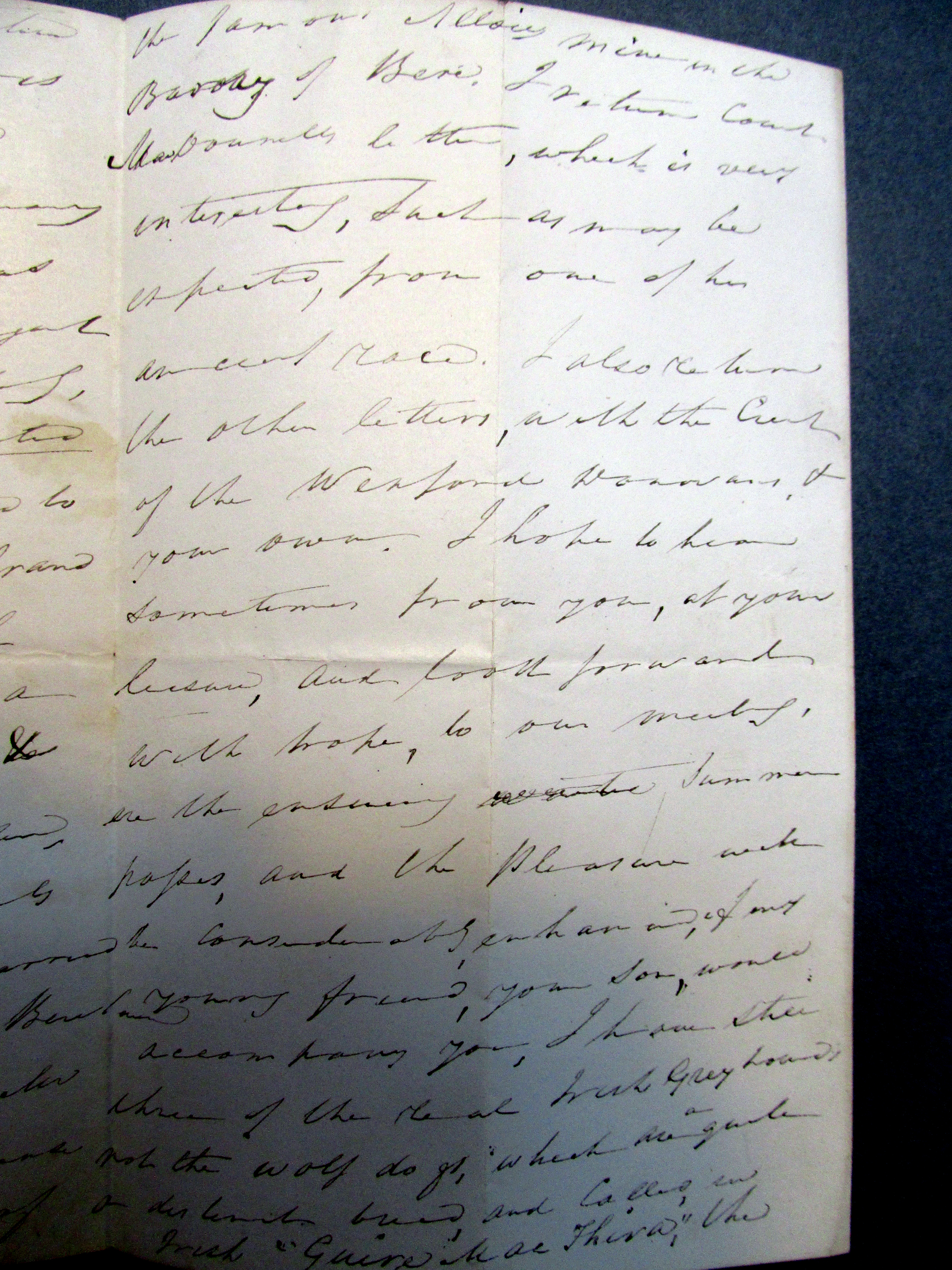 Timothy O’Donovan JP to Dr. John O’Donovan on The Real Irish Greyhound not the wolf dog called the …..‘Guire Mac Fhira’ the Irish Grey Hound is called ‘Conn’ and was spelled Gre-hound, this breed is quite smooth silk like satin it is a mistake to confuse the rough or wiry dog being of Scotch descent and never could compete with the real Irish in Fleetship or Beauty, Richard Hungerford Evanson, Coursing at Dromreagh in the 1864.