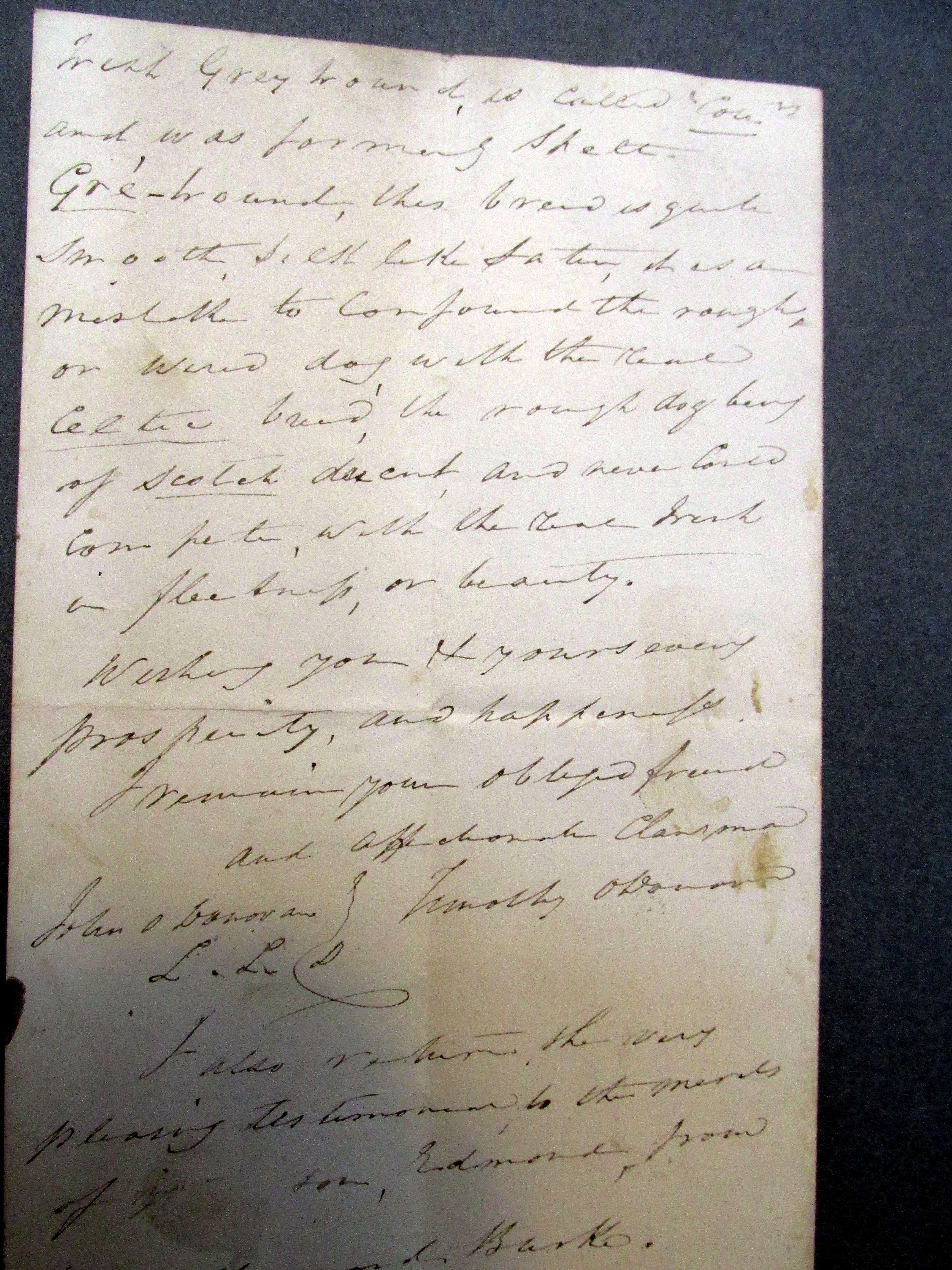 Timothy O’Donovan JP to Dr. John O’Donovan on The Real Irish Greyhound not the wolf dog called the …..‘Guire Mac Fhira’ the Irish Grey Hound is called ‘Conn’ and was spelled Gre-hound, this breed is quite smooth silk like satin it is a mistake to confuse the rough or wiry dog being of Scotch descent and never could compete with the real Irish in Fleetship or Beauty, Richard Hungerford Evanson, Coursing at Dromreagh in the 1864.
