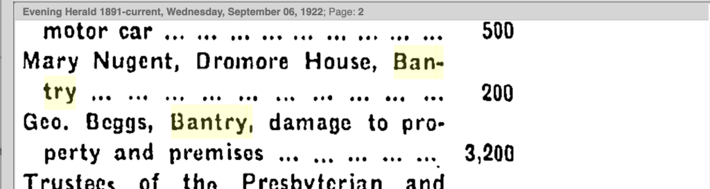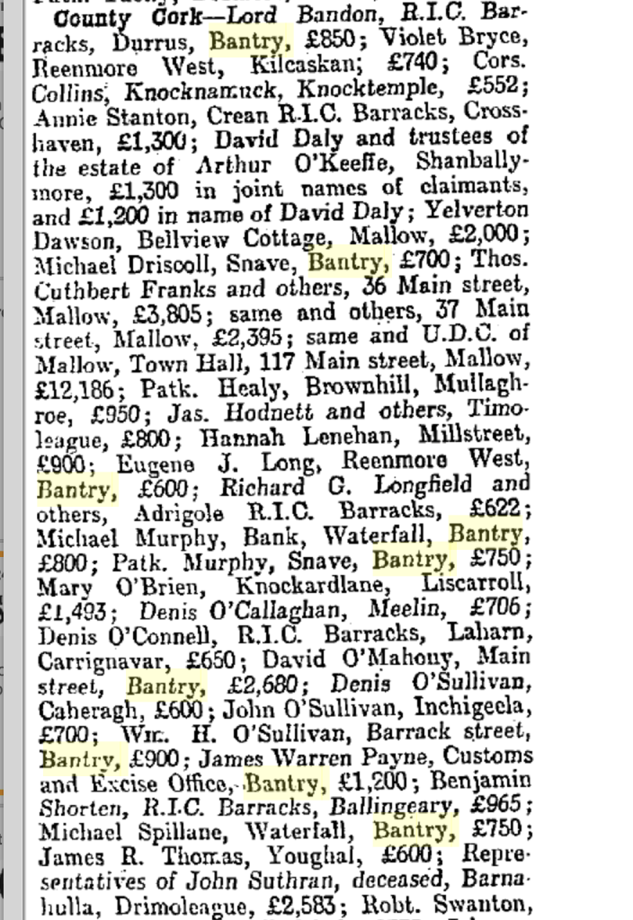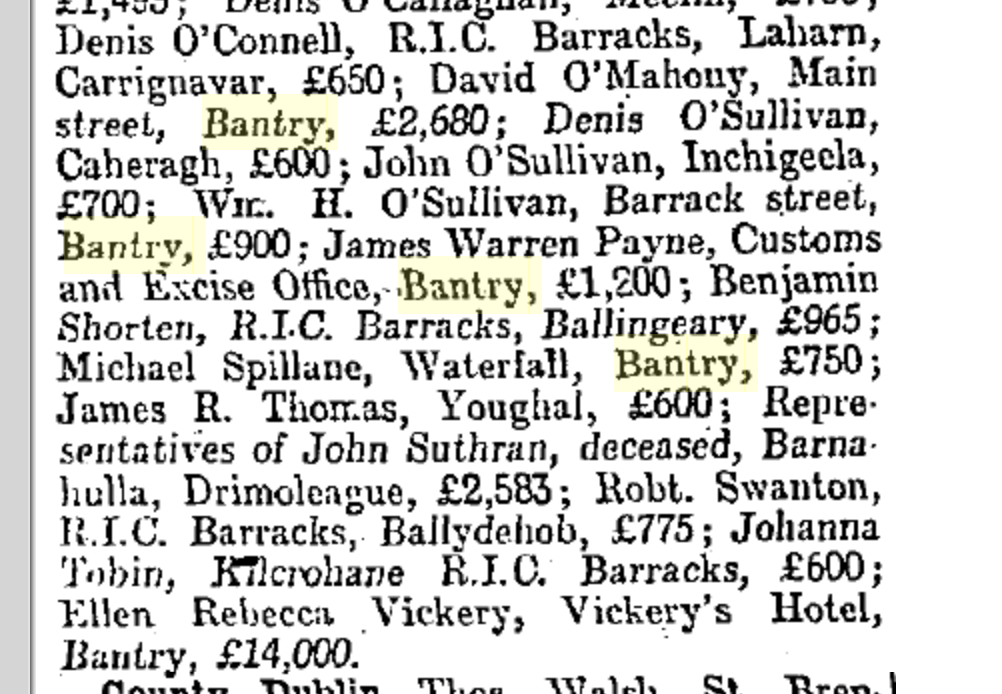 1908 Solicitors. O’Leary Patrick, The Square Wolfe Jasper, The Square. Attending funeral James Flynn, (1817-1896), Caherdaniel, died 1896. Funeral of 1900, James Wiseman, Beach, Bantry. 1904 relief fund Charles Martin McCarthy wife and children he a boatman Bantry died trying to save a sailor. 1909 attending the funeral of Dr. William Jennings, J.P. 1917 attending funeral of three crew lost when Minnehaha torpedoed by the Germans. ” “Magistrate William Henry O’Sullivan, 1897, The Square/Main St., Bantry, daughter Annie m 1906 Patrick O’Leary, Solicitor, Bantry son of Florence Glendart, listed 1921. 1898 funeral of Mrs. Margaret O’Connor mother of Benjamin, JP. 1904 funeral of Daniel O’Donovan, Solicitor and Land Owner, Skibbereen. 1909 attending funeral of Mrs. Martha Rogers, Durrus. 1913 attending the funeral, Skibberen, Dr. Patrick (PJ) Burke, Skibbereen. ” “1941 funeral D. O’Leary, Solicitor, ex M.P., Arklow brother J. O’Leary, brother Miss M. O’Leary, Dunmanway, sister Mrs. Creedon, Parkgariff, Monkstown, sister Mr. J. O’Leary, Dunmanway W. H. O’Sullivan, Bantry brother-in-law Charles Donovan, Bantry, brother-in-law D. Creedon, Solicitor, Dunmanway, nephew T. O’Brien, Killeagh, nephew Mary O’Leary, Bantry, niece Patricia Creedon, Monkstown, niece ” His uncle Patrick O’Leary, Glendart, was involved in the Fenian raid on Canada mentioned by Rocky Mountain. Died 1936, Mountmellick William Clerke Apprentice to Patrick O’Leary, qualified 1919 Pracised in Mountmellck died there 1936. Attending 1923, Mrs. Nora O’Leary nee McCarthy Courtmacsherry, Woodlands, Dunmanway. Wife of Jeremiah O’Leary Solicitor.