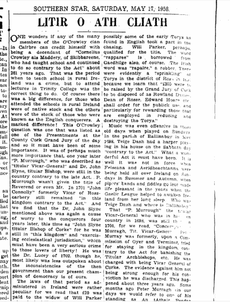 In this 1890 account of West Cork against Parnell the clergy were very much in control. The Catholic Church is blamed for the downfall of Parnell. However the ire is misdirected. The pressure on Gladstone came from his Welsh Methodist constituents who demanded an end to the alliance with the Irish Parliament Party if it continued to be led by an adulterer as they perceived it. Parnell lived openly in South London for a number of years with Kitty O’Shea.