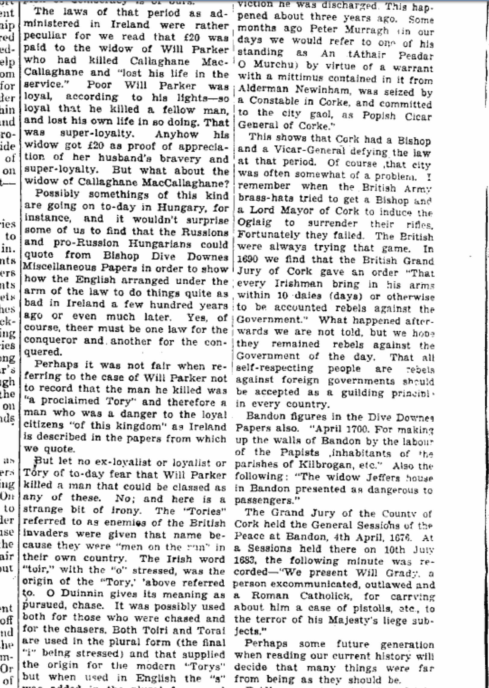A frequent narrative is the imposition of a severe yoke by Irish Protestants on the Catholics who vastly outnumber them. In the Case of Cork city he says that in 1835 there were 80,000 Catholics out of a population of 107,000. All the officers of the Corporation are Protestants.