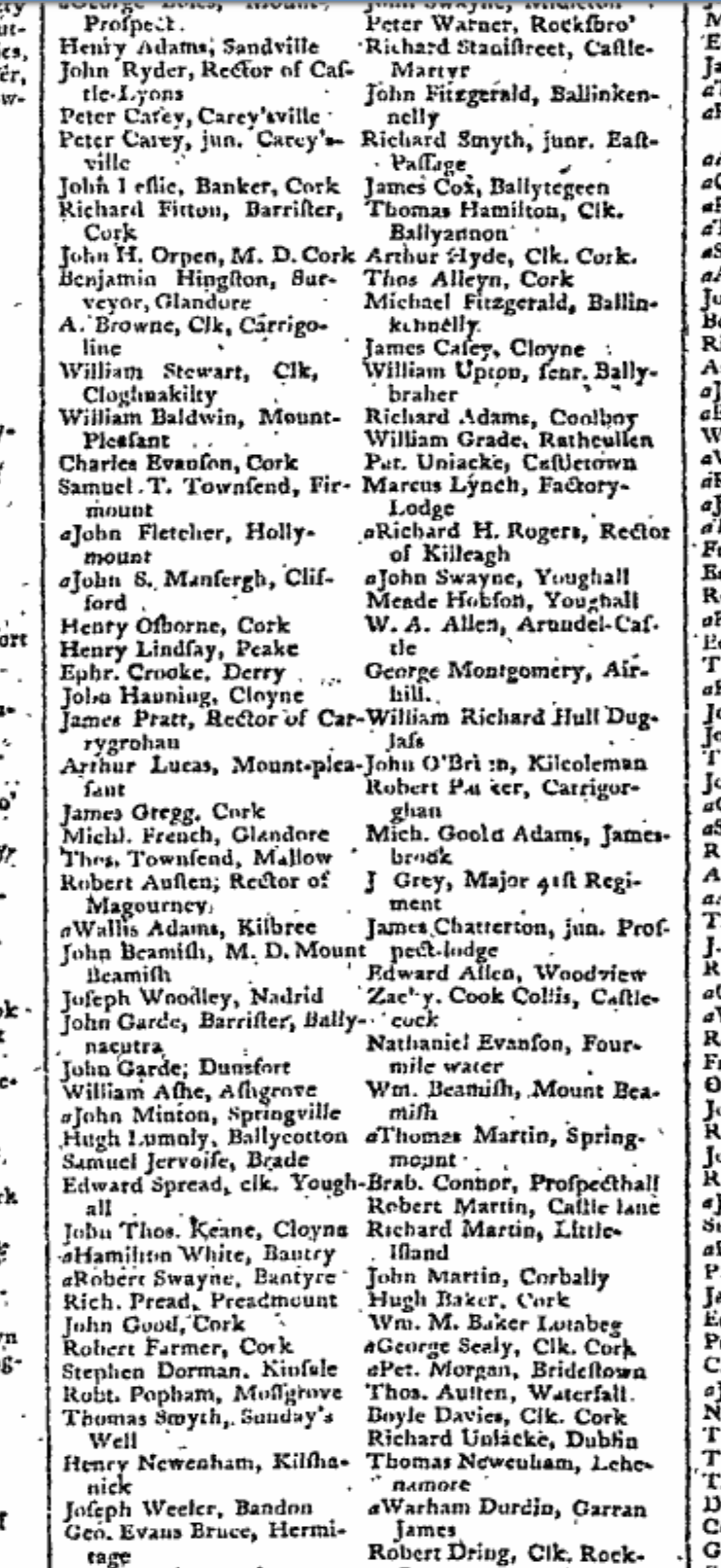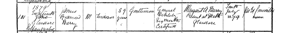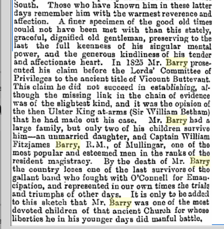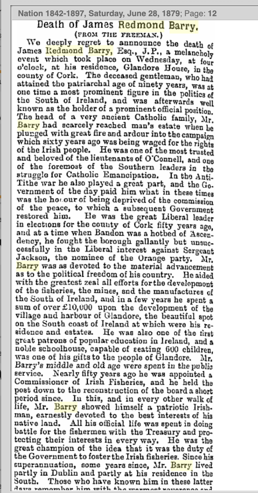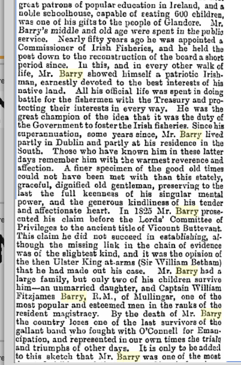 James Redmond Barry,(1790 -1879), Pre 1820, Glandore and 11 Great Denmark St., Dublin, Fishery Commissioner advocate of fishery development in West Cork, Improving Landlord, Petitioned House of Lords to Vote 1821 as Representative of dormant title of Viscount Buttevant from 1405. 1818 encouraging Flax growing with mother’s assistance, mentions his farm of around 300 acres population 328 of whom one third at linen. 1821 request to Chief Secretary with Rev. Armiger Sealy, John Swete, Thomas Walker that military be sent to Timoleague re Captain Rock disturbances. 1822 Cork Trustee for The Encouraging Industry in Ireland. 1828 Quarter Session Bandon. 1828 seeking reform of the House of Commons. 1832 cholera. Involved with Richard Townsend, and Thomas Somerville, Drishane in setting up Agricultural and Country Bank in Skibbereen, April 1835. Subscriber Lewis Topographical Dictionary of Ireland 1837. Attended Reformers Dinner Bandon 1839 for Daniel O’Connell, MP,. Attending Famine Relief Meeting Dunmanway 1846. Subscriber at Dublin 1861 Rev. Gibson’s History of Cork. In October 1861 at O’Donovan’s Cove married Anne Mary J 3rd daughter of Timothy J.P. to David Fitzjames Barry, 2nd son to Redmond Barry, Commissioner of Fisheries Esq. (and a political ally of Timothy). She is later Executrix of her father’s estate then a widow. Listed 1870, Dublin, 439 acres. Member election committee McCarthy Downing, Skibbereen, 1868. Son Captain FitzJames Barry, J.P., grandson Richard Fitzwilliam Barry, J.P., solicitor, Clerk of the Crown, King’s Co., listed 1885-6. Left £1,500. Subscriber memorial John O’Hea J.P., Clonakilty, 1847. Member as James, Bandon, Commission on Magistrates 1838. attended Reformers Dinner, Bandon, 1839 for Daniel O’Connell, MP. Petition 1840 on Catholic Equality. Invitation by Henry Townsend DL, 1839, on behalf of The Reformers of the West Riding of Cork to Daniel O’Connell MP to Dinner in Bandon, Co Cork, with 200 Liberals in attendance including, Francis Bernard Beamish MP (1802-1868), Rickard Deasy (1766-1852) Brewer Clonakilty, James Clugston Allman Distiller Bandon, James Redmond Barry J.P., Commissioner for Fisheries, Edward O’Brien, Masonic Lodge Bandon, John Hurley Brewer, Major E. Broderick, Henry Owen Beecher Townsend (1775-1847), Major Mathew Scott J.P. (1779-1844), Philip Harding, Carrigafooka, Macroom, Richard Dowden (1794-1861) Unitarian, Frances Coppinger Esq., Parkview, Bandon. 1858 member Kilkenny and South-East of Ireland Archaeological Society.