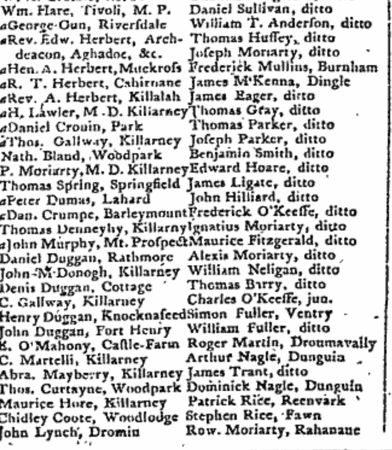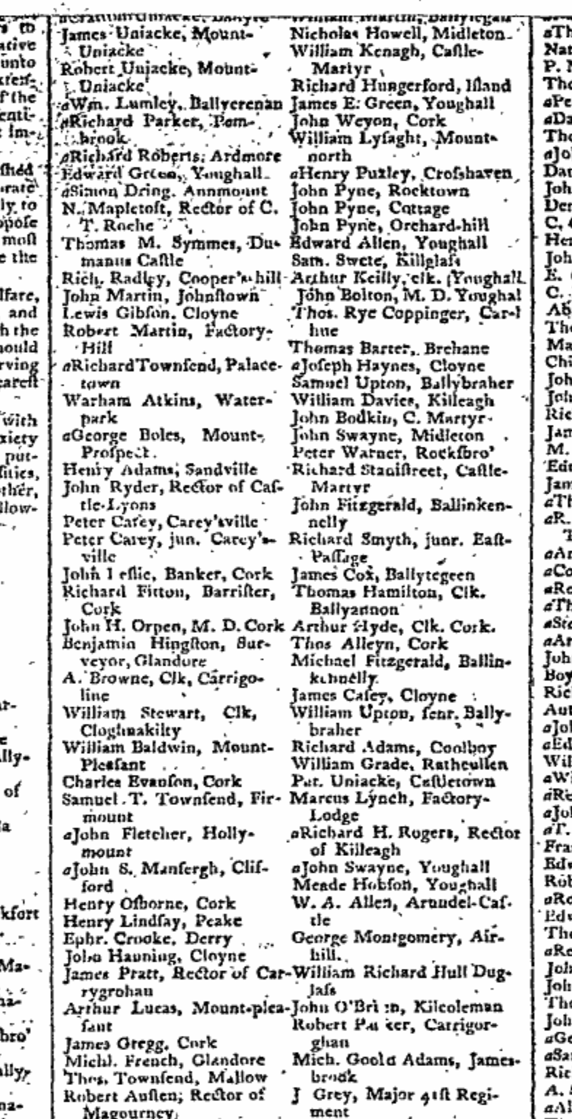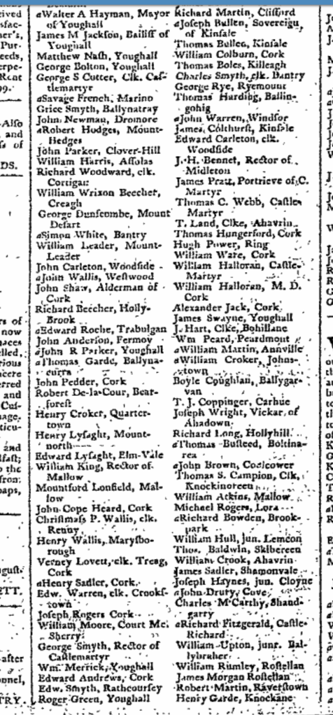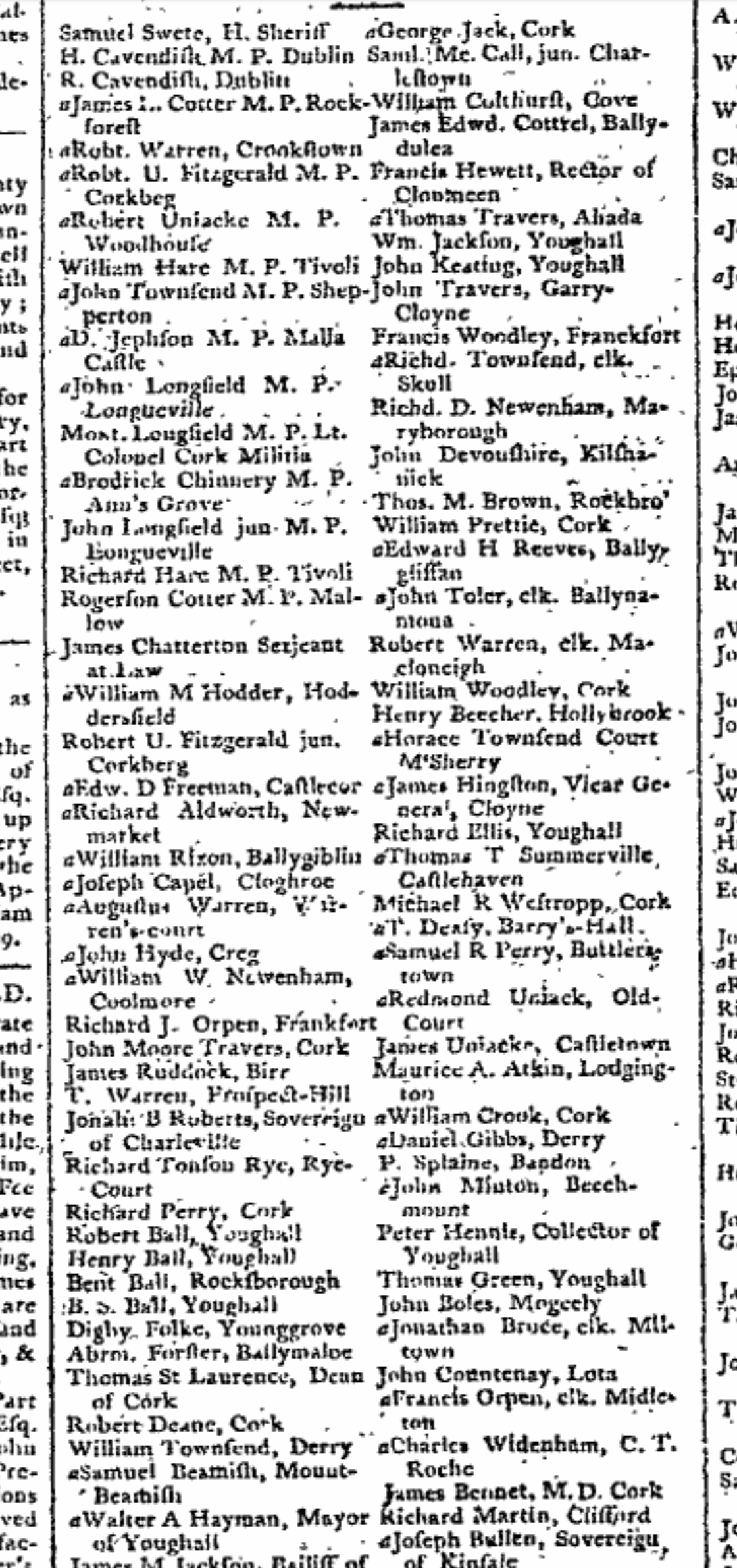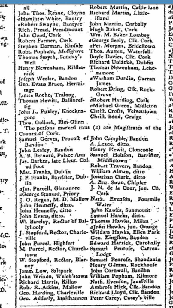 James Redmond Barry,(1790 -1879), Pre 1820, Glandore and 11 Great Denmark St., Dublin, Fishery Commissioner advocate of fishery development in West Cork, Improving Landlord, Petitioned House of Lords to Vote 1821 as Representative of dormant title of Viscount Buttevant from 1405. 1818 encouraging Flax growing with mother’s assistance, mentions his farm of around 300 acres population 328 of whom one third at linen. 1821 request to Chief Secretary with Rev. Armiger Sealy, John Swete, Thomas Walker that military be sent to Timoleague re Captain Rock disturbances. 1822 Cork Trustee for The Encouraging Industry in Ireland. 1828 Quarter Session Bandon. 1828 seeking reform of the House of Commons. 1832 cholera. Involved with Richard Townsend, and Thomas Somerville, Drishane in setting up Agricultural and Country Bank in Skibbereen, April 1835. Subscriber Lewis Topographical Dictionary of Ireland 1837. Attended Reformers Dinner Bandon 1839 for Daniel O’Connell, MP,. Attending Famine Relief Meeting Dunmanway 1846. Subscriber at Dublin 1861 Rev. Gibson’s History of Cork. In October 1861 at O’Donovan’s Cove married Anne Mary J 3rd daughter of Timothy J.P. to David Fitzjames Barry, 2nd son to Redmond Barry, Commissioner of Fisheries Esq. (and a political ally of Timothy). She is later Executrix of her father’s estate then a widow. Listed 1870, Dublin, 439 acres. Member election committee McCarthy Downing, Skibbereen, 1868. Son Captain FitzJames Barry, J.P., grandson Richard Fitzwilliam Barry, J.P., solicitor, Clerk of the Crown, King’s Co., listed 1885-6. Left £1,500. Subscriber memorial John O’Hea J.P., Clonakilty, 1847. Member as James, Bandon, Commission on Magistrates 1838. attended Reformers Dinner, Bandon, 1839 for Daniel O’Connell, MP. Petition 1840 on Catholic Equality. Invitation by Henry Townsend DL, 1839, on behalf of The Reformers of the West Riding of Cork to Daniel O’Connell MP to Dinner in Bandon, Co Cork, with 200 Liberals in attendance including, Francis Bernard Beamish MP (1802-1868), Rickard Deasy (1766-1852) Brewer Clonakilty, James Clugston Allman Distiller Bandon, James Redmond Barry J.P., Commissioner for Fisheries, Edward O’Brien, Masonic Lodge Bandon, John Hurley Brewer, Major E. Broderick, Henry Owen Beecher Townsend (1775-1847), Major Mathew Scott J.P. (1779-1844), Philip Harding, Carrigafooka, Macroom, Richard Dowden (1794-1861) Unitarian, Frances Coppinger Esq., Parkview, Bandon. 1858 member Kilkenny and South-East of Ireland Archaeological Society.
