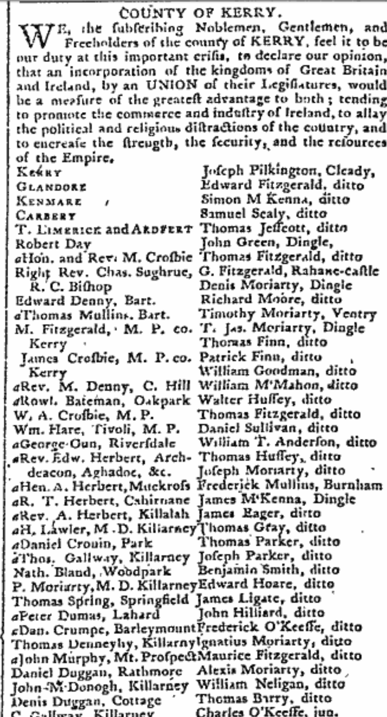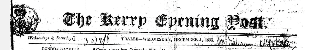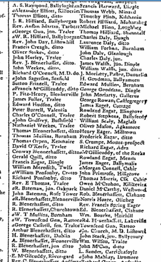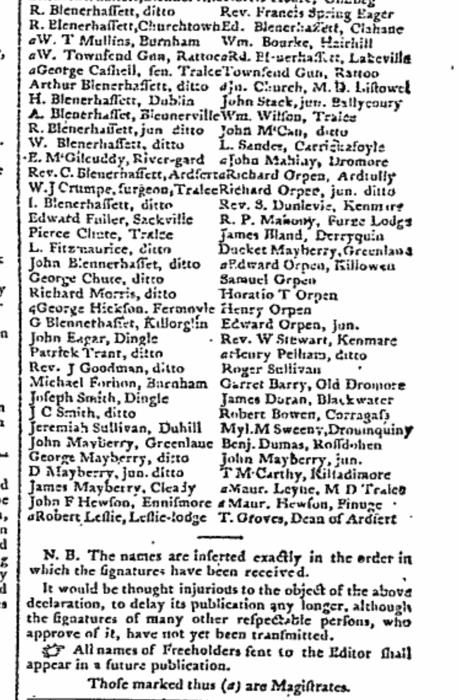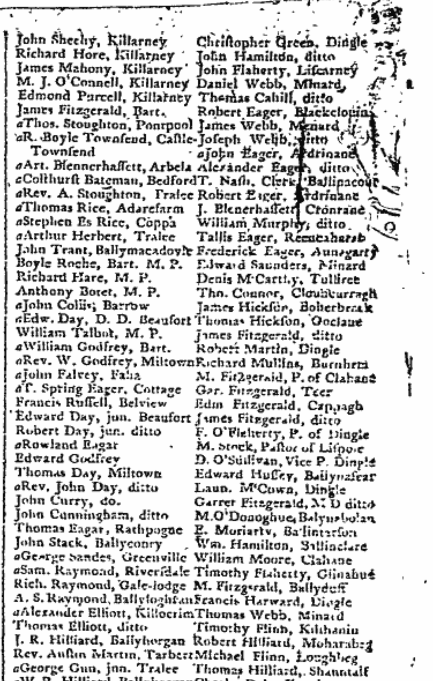 James Redmond Barry,(1790 -1879), Pre 1820, Glandore and 11 Great Denmark St., Dublin, Fishery Commissioner advocate of fishery development in West Cork, Improving Landlord, Petitioned House of Lords to Vote 1821 as Representative of dormant title of Viscount Buttevant from 1405. 1818 encouraging Flax growing with mother’s assistance, mentions his farm of around 300 acres population 328 of whom one third at linen. 1821 request to Chief Secretary with Rev. Armiger Sealy, John Swete, Thomas Walker that military be sent to Timoleague re Captain Rock disturbances. 1822 Cork Trustee for The Encouraging Industry in Ireland. 1828 Quarter Session Bandon. 1828 seeking reform of the House of Commons. 1832 cholera. Involved with Richard Townsend, and Thomas Somerville, Drishane in setting up Agricultural and Country Bank in Skibbereen, April 1835. Subscriber Lewis Topographical Dictionary of Ireland 1837. Attended Reformers Dinner Bandon 1839 for Daniel O’Connell, MP,. Attending Famine Relief Meeting Dunmanway 1846. Subscriber at Dublin 1861 Rev. Gibson’s History of Cork. In October 1861 at O’Donovan’s Cove married Anne Mary J 3rd daughter of Timothy J.P. to David Fitzjames Barry, 2nd son to Redmond Barry, Commissioner of Fisheries Esq. (and a political ally of Timothy). She is later Executrix of her father’s estate then a widow. Listed 1870, Dublin, 439 acres. Member election committee McCarthy Downing, Skibbereen, 1868. Son Captain FitzJames Barry, J.P., grandson Richard Fitzwilliam Barry, J.P., solicitor, Clerk of the Crown, King’s Co., listed 1885-6. Left £1,500. Subscriber memorial John O’Hea J.P., Clonakilty, 1847. Member as James, Bandon, Commission on Magistrates 1838. attended Reformers Dinner, Bandon, 1839 for Daniel O’Connell, MP. Petition 1840 on Catholic Equality. Invitation by Henry Townsend DL, 1839, on behalf of The Reformers of the West Riding of Cork to Daniel O’Connell MP to Dinner in Bandon, Co Cork, with 200 Liberals in attendance including, Francis Bernard Beamish MP (1802-1868), Rickard Deasy (1766-1852) Brewer Clonakilty, James Clugston Allman Distiller Bandon, James Redmond Barry J.P., Commissioner for Fisheries, Edward O’Brien, Masonic Lodge Bandon, John Hurley Brewer, Major E. Broderick, Henry Owen Beecher Townsend (1775-1847), Major Mathew Scott J.P. (1779-1844), Philip Harding, Carrigafooka, Macroom, Richard Dowden (1794-1861) Unitarian, Frances Coppinger Esq., Parkview, Bandon. 1858 member Kilkenny and South-East of Ireland Archaeological Society.