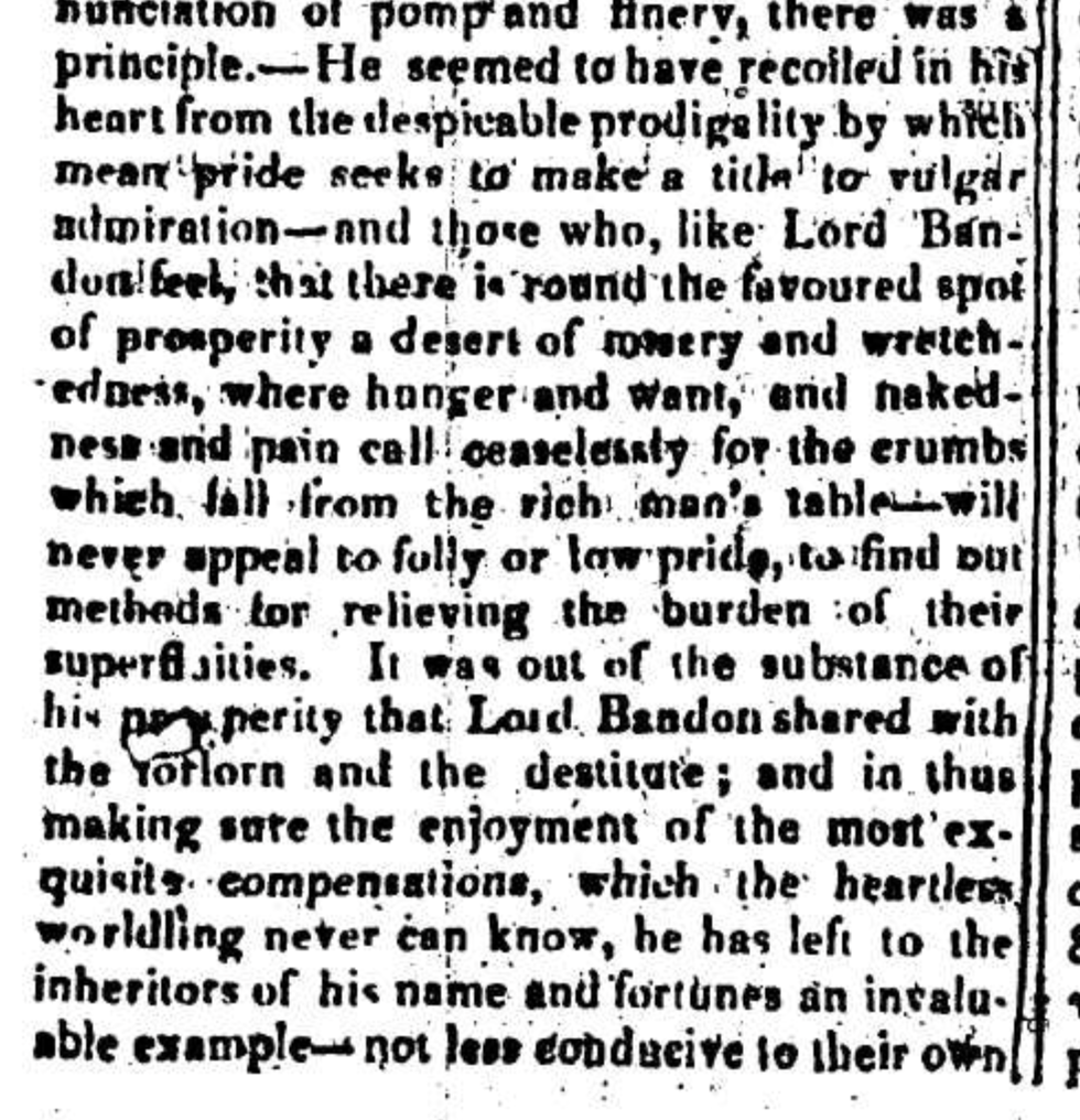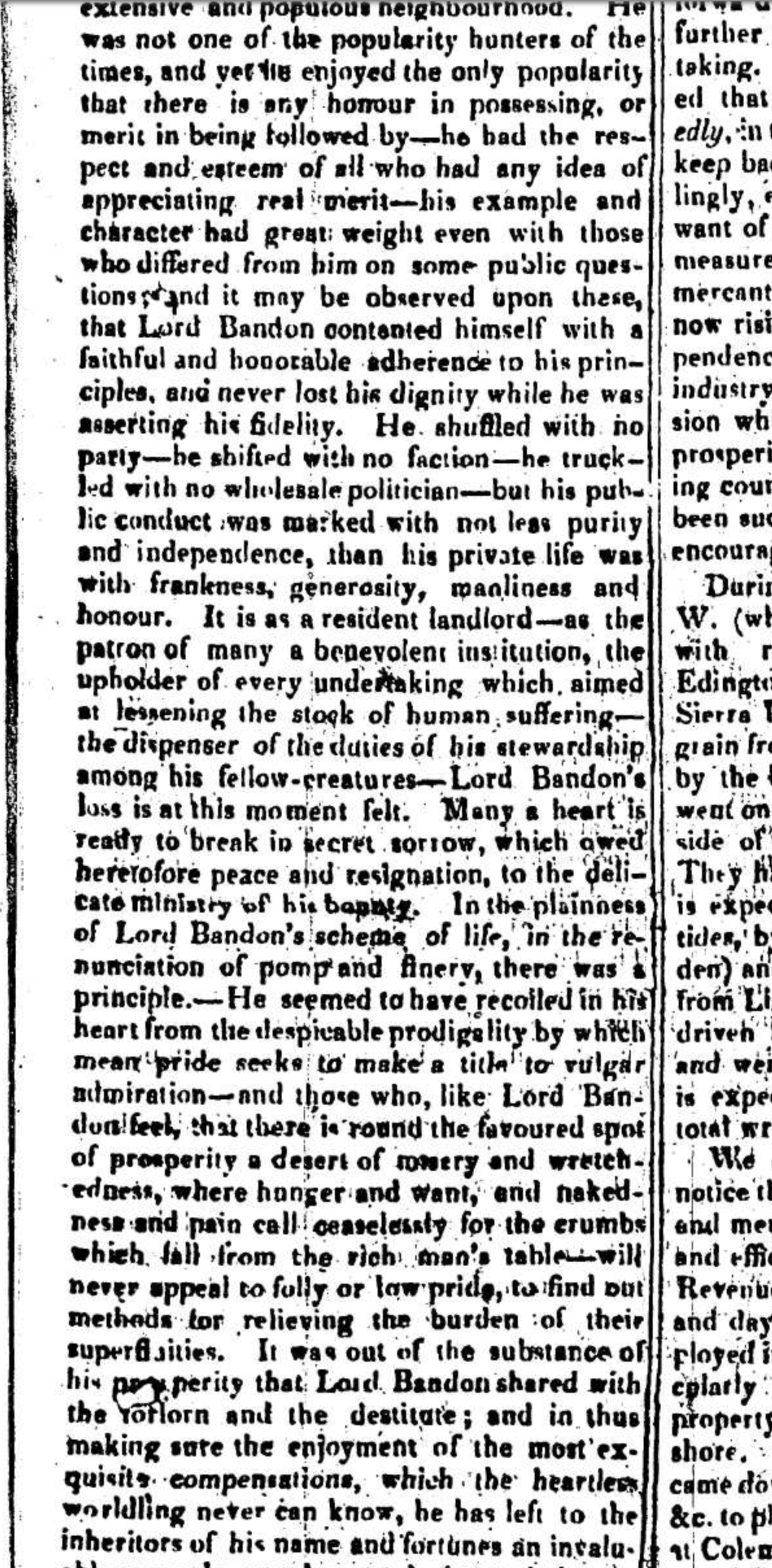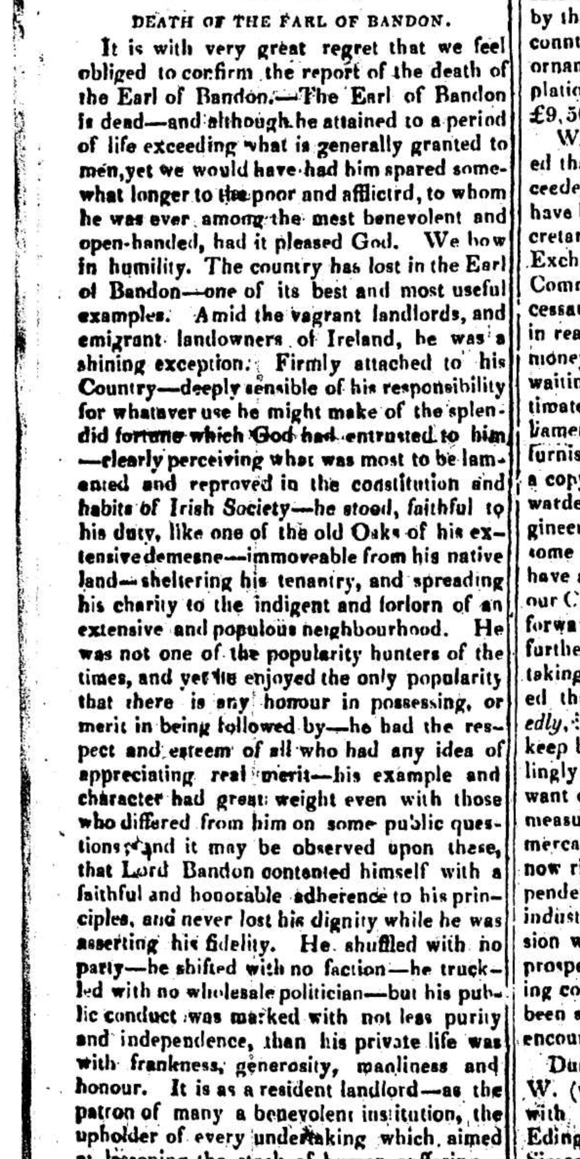 Right Honourable Honourable James 2nd Earl of Bandon, Custos Rotorum, (1785-1856), Castlebernard, FRANCIS (1st EARL of BANDON) and HARRIET (Boyle) had James (heir and 2nd Earl born 14th June 1785 in Bandon and died 31st October 1856 at Castle Bernard) m 13th March, 1809 in Cashel Mary Susan Brodrick eldest daughter of Charles, Archbishop of Cashel and sister of Charles, 6th Viscount Midleton. Mary was born 9th October 1787 and died 23rd April 1870, buried in Bandon. Due to rising war related prices land rents estimated 1811 at £30,000. Succeeded to title and estate after his father’s death in 1830. Following a large Protestant meeting 1834 at Castlebenard nominated to prepare a petition to the British King and Parliament with the Rev. Somers Payne, Councillor Mannix, Lords Berehaven and Bandon. Subscriber Lewis Richard Dowden papers: 1837. 1842 Subscriber Jacksons Co. and City Directory. 1844 Printed handbill/notice , ‘Cork Art Union for the promotion of the fine arts in the South of Ireland’, annual subscription appeal. President is Lord Viscount Bernard MP (Lord Bandon). Printed by W Scraggs, 102 Patricks Street. (1p) Subscriber John Ryan, 1845 ’20 Years of Popish Persecution’. Made huge efforts during the Famine to secure relief. Co. Grand Master Orange Order. Fellow Royal Society 1845. Member Commission on Magistrates 1838 subscriber, 2 copies, 1861 to Smith’s History of Cork. Bandon 1869.