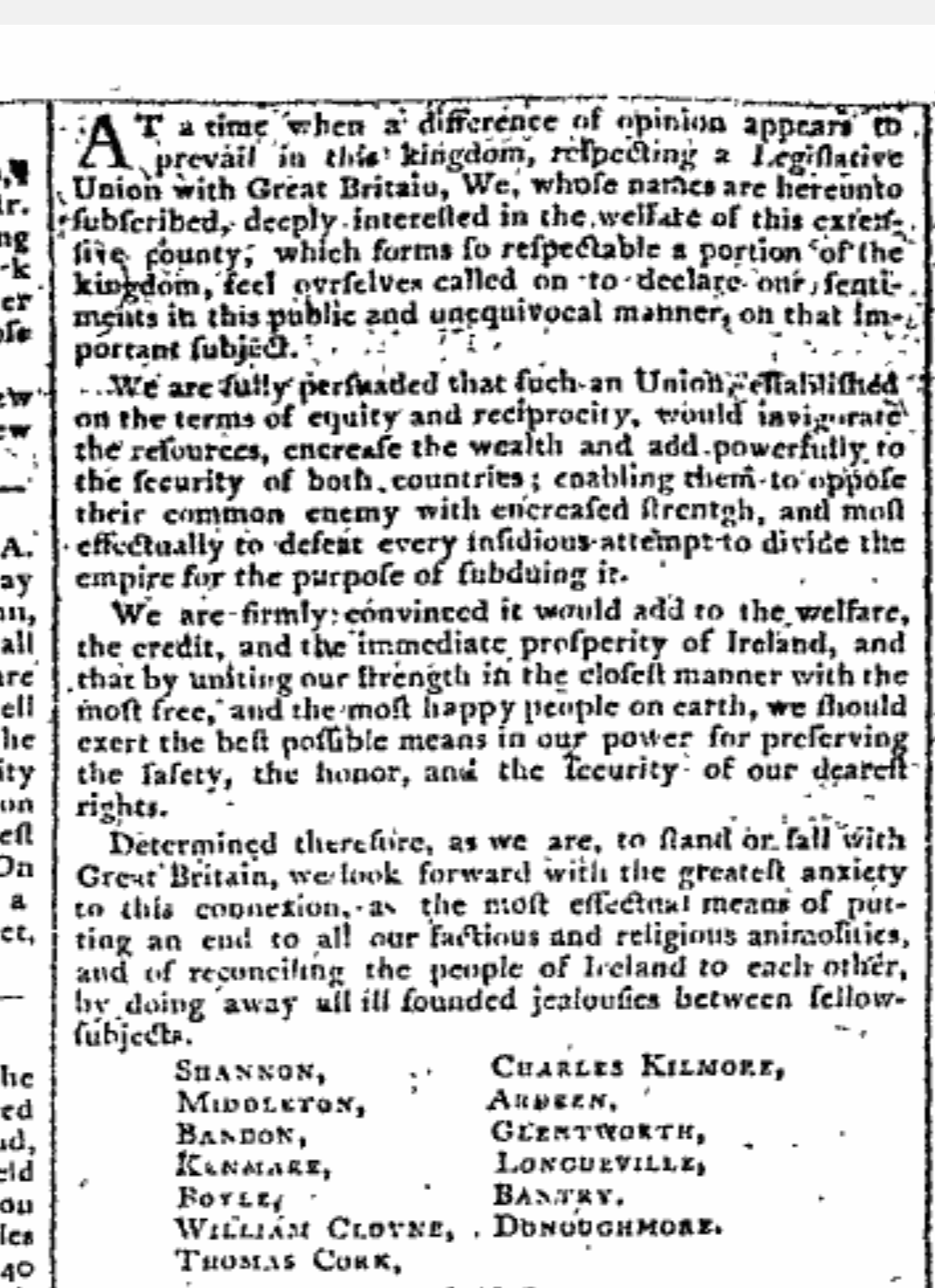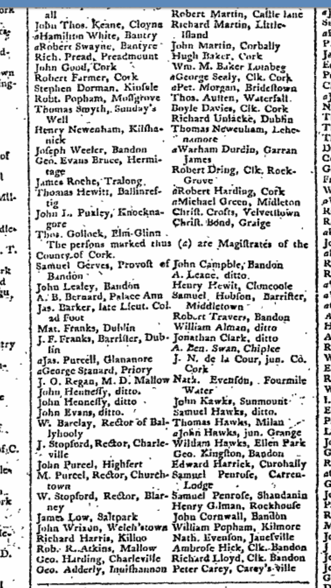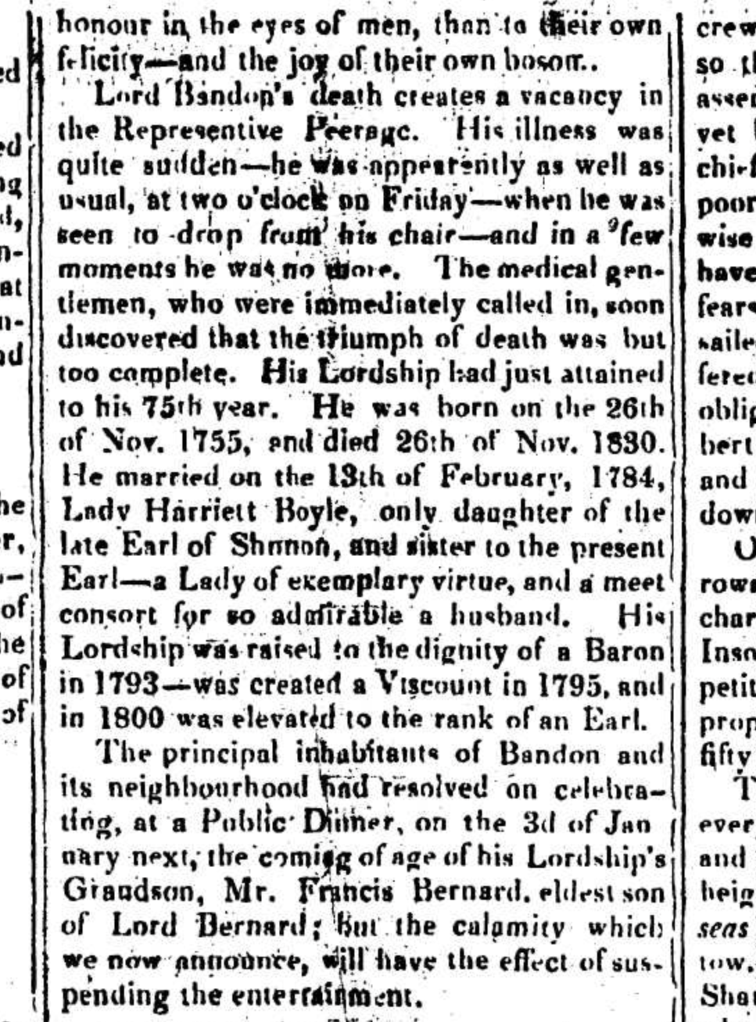 Francis Bernard, 1st Earl of Bandon (1755-1830), 1772, Castle Bernard, Bandon, only son James Bernard and Esther Smith d Percy Smith. M Lady Catherine Henrietta Boyle d Richard, 2nd Earl of Shannon. MP Ennis 1778-83, Delegate 1783 to Irish Volunteer convention. Subscriber, James Mullalla, Review of Irish Affairs 1688-1795. She arranged for donation of site for Gallows Hill catholic Church in thanks for Fr. Shinnick curing her son later 2nd Earl quested to be president of Bandon Brunswick Constitutional Club 1828 donated £50. Non marital children. Bandonbridge in the Irish Parliament until 1790. Lady Charlotte Bernard, 2nd daughter married 3rd Viscount Doneraile. Freeman of Cork 1777. 1805 Return by Commissioners Appointed under Act 40, George 111, cap.34, King of England Compensation for Abolition of Pocket and Rotten Boroughs. 1819 Member of the Association Incorporated for Discontinuancy Vice and Promoting the Knowledge and Practise of The Christian Religion. Rathcormac, Francis Earl of Bandon, Sampson Stawell (Kinsale) Viscount Doneraile, Trustees in will of Lord Riversdale, 1787, (Hull, Schull family), £15,000/£17.3 Million. Glowing obituary to him as a resident Landlord