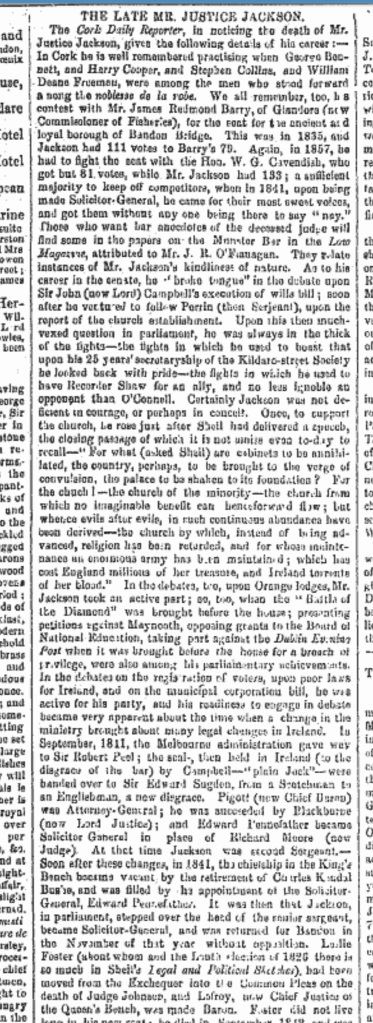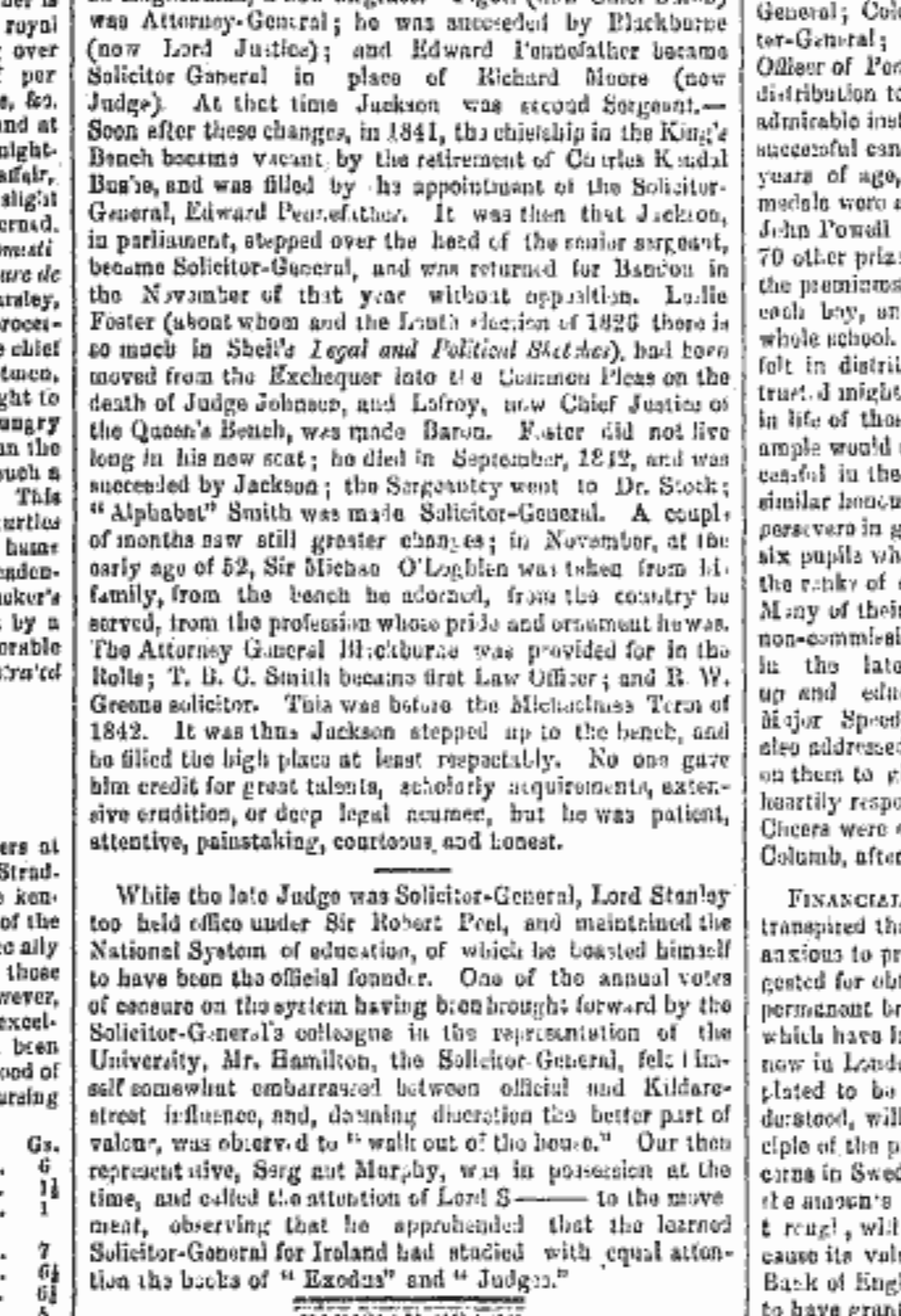The various obituaries refer to his tenure as a Judge in complementary fashion, Like many before him he discarded his sectarian and Orange baggage on entering the 4 Courts as a newly appointed Irish Judge in 1842 and in the long tradition of Irish Judges gave a fair and impartial hearing to those who appeared before him. It would seem that in the criminal cases he was lenient in sentencing.