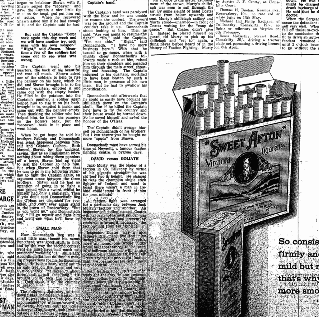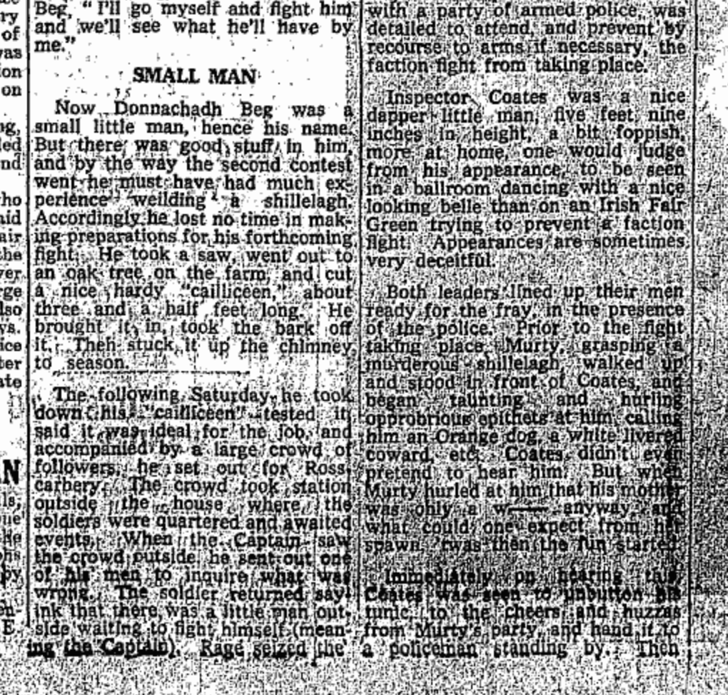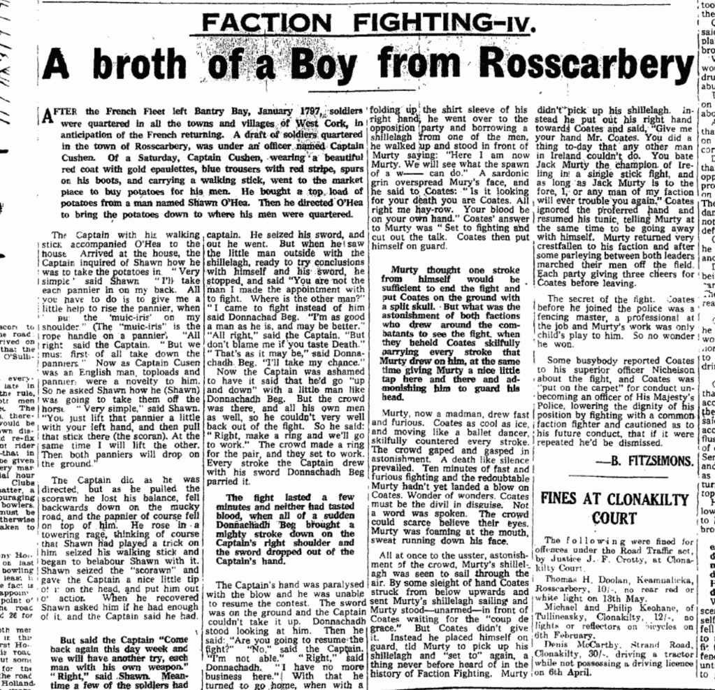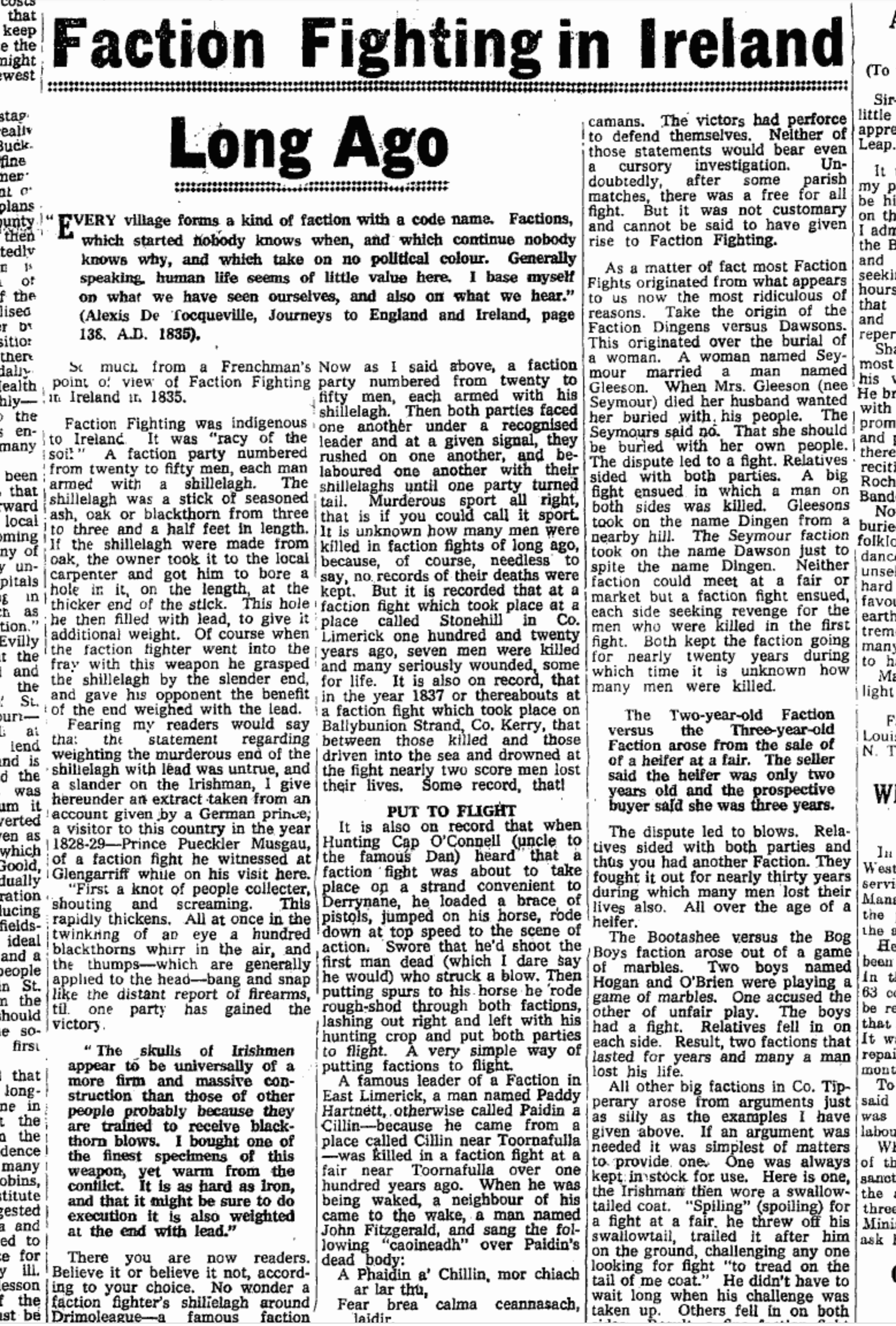 Frank O’Mahony the late Bantry Solicitor wrote of his native Kilcrohane said that the last faction fight there was in the 1820s.