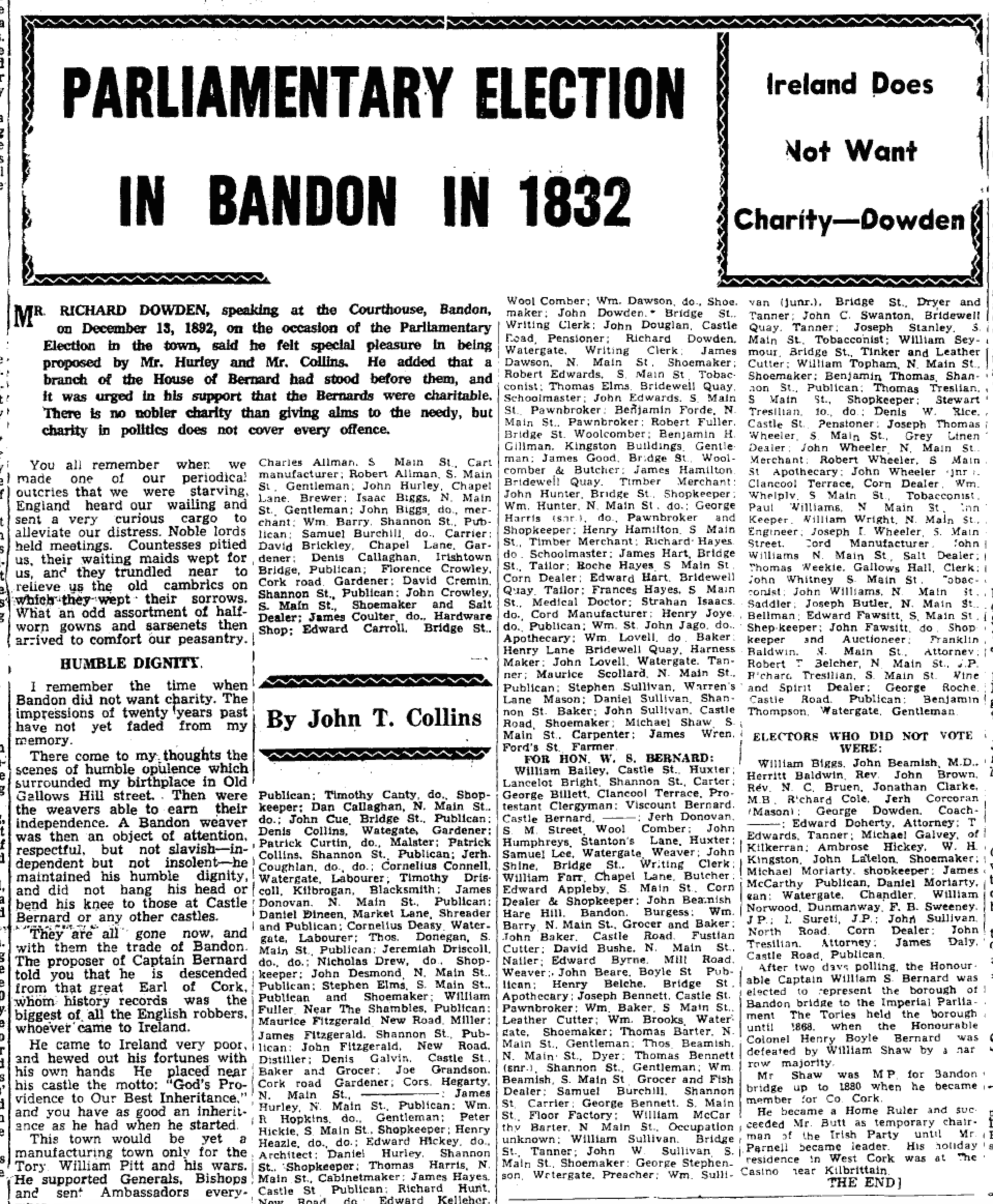 1832. Bandon Parliamentary Election. Names, Addresses and Occupation of Electors.