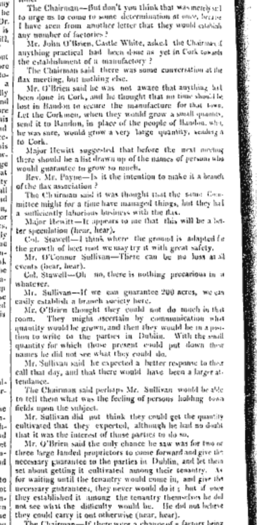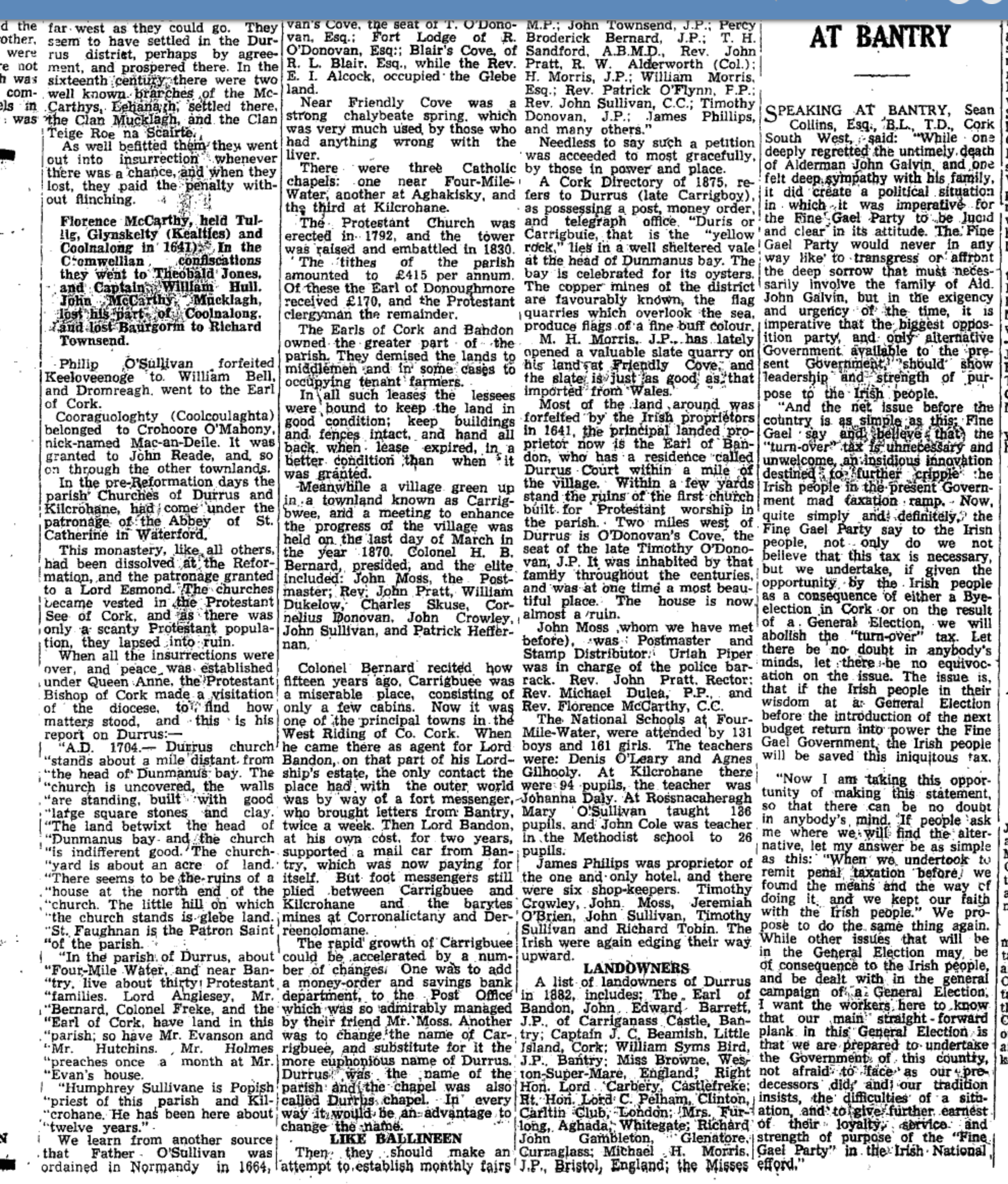 John O’Connor, Esq., Landlord, Middleman, Merchant, Bantry came into an estate of 700 acres in 1825, 4 years of arrears by Tenants of Lord Riversdale, Prize Fighters, Head of a Faction, He forgave 3 years and a More Industrious Tenantry, Instead of Being in the Public House at Fairs and Market Fighting, you have Slated Houses and Barns, where there was nothing but Poverty and Indigence 13 £10 Freeholders and one £20.