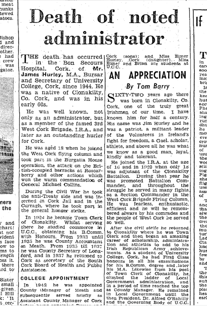 im Hurley was born in Clonakilty, County Cork on 26 February 1902. In his youth, he became involved in the Irish struggle for independence. He played a prominent role in the War of Independence as leader of a flying column in the Third Cork Brigade. Following the publication of the Anglo-Irish Treaty, Hurley took the republican side in the subsequent Civil War. He was later interred in Cork and the Curragh but was released in 1924. Following this, Hurley returned to his native Clonakilty where he became town clerk and shortly afterwards, he enrolled as a night student at University College Cork. It was here that his sporting career began in earnest as he won a Fitzgibbon Cup medal with UCC’s hurlers.