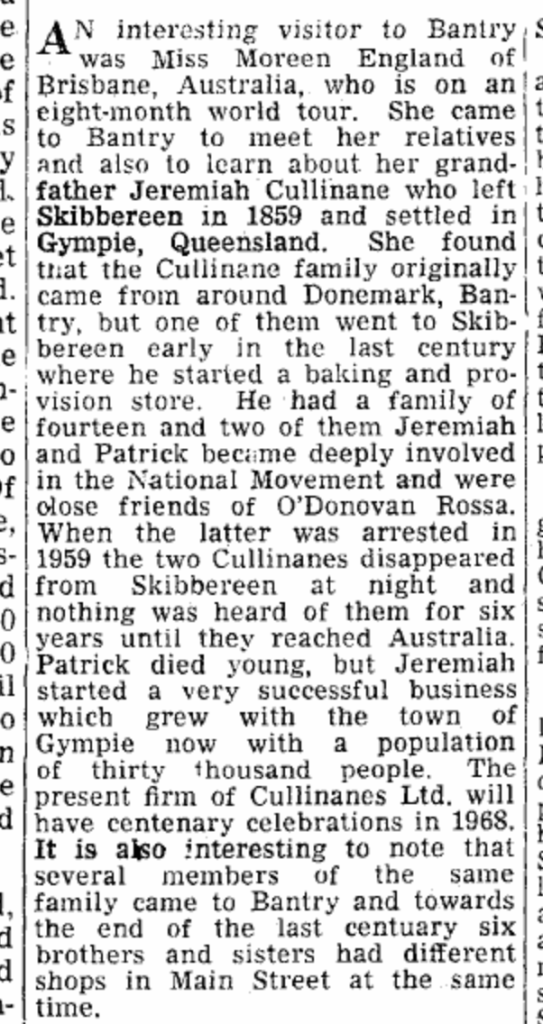The Cullinanes of Clonakilty, Skibbereen, Bantry, Gympie, Queensland, Australia. Jeremiah and Patrick Cullinane Associates of Jeremiah O’Donovan Rossa.