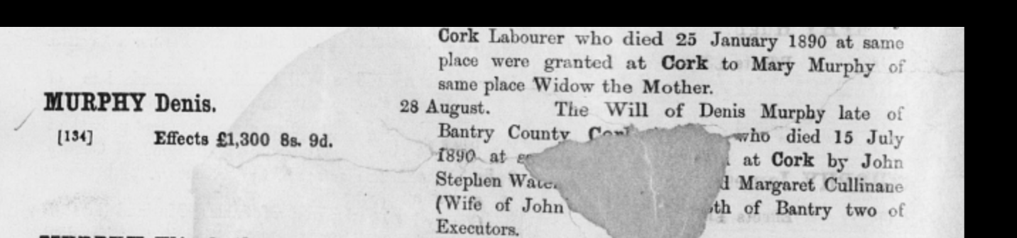 John Cullinane, (1834-1900) The Square, Bantry. 1887 Committee to promote the Town Improvement Act for Bantry. Donor and committee member 1895 to the Bantry Foreshore Reclamation Fund. Landlord Whitechurch, Co. Cork allowed tenants a 50% reduction in rent. 1895 treasurer Bantry Terrier Coursing Club. 1898 thanked by Bantry Board of Guardians for providing a meal for the inmate of the workhouse consisting of meat and vegetable followed by currant cake and oranges. Attending listed as ‘John” funeral Bantry 1899 of Miss O’Connor of merchant family.