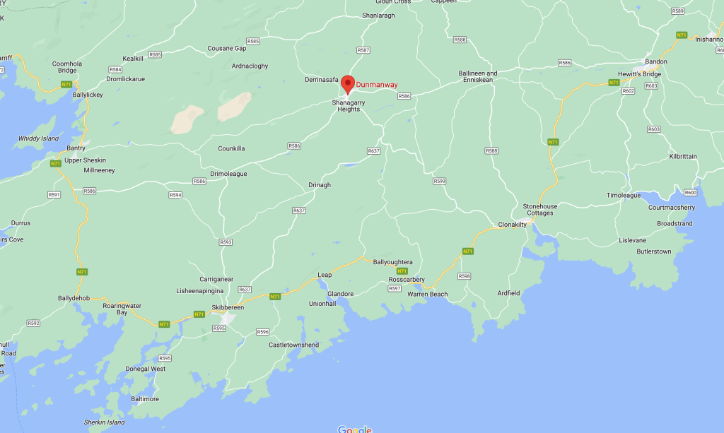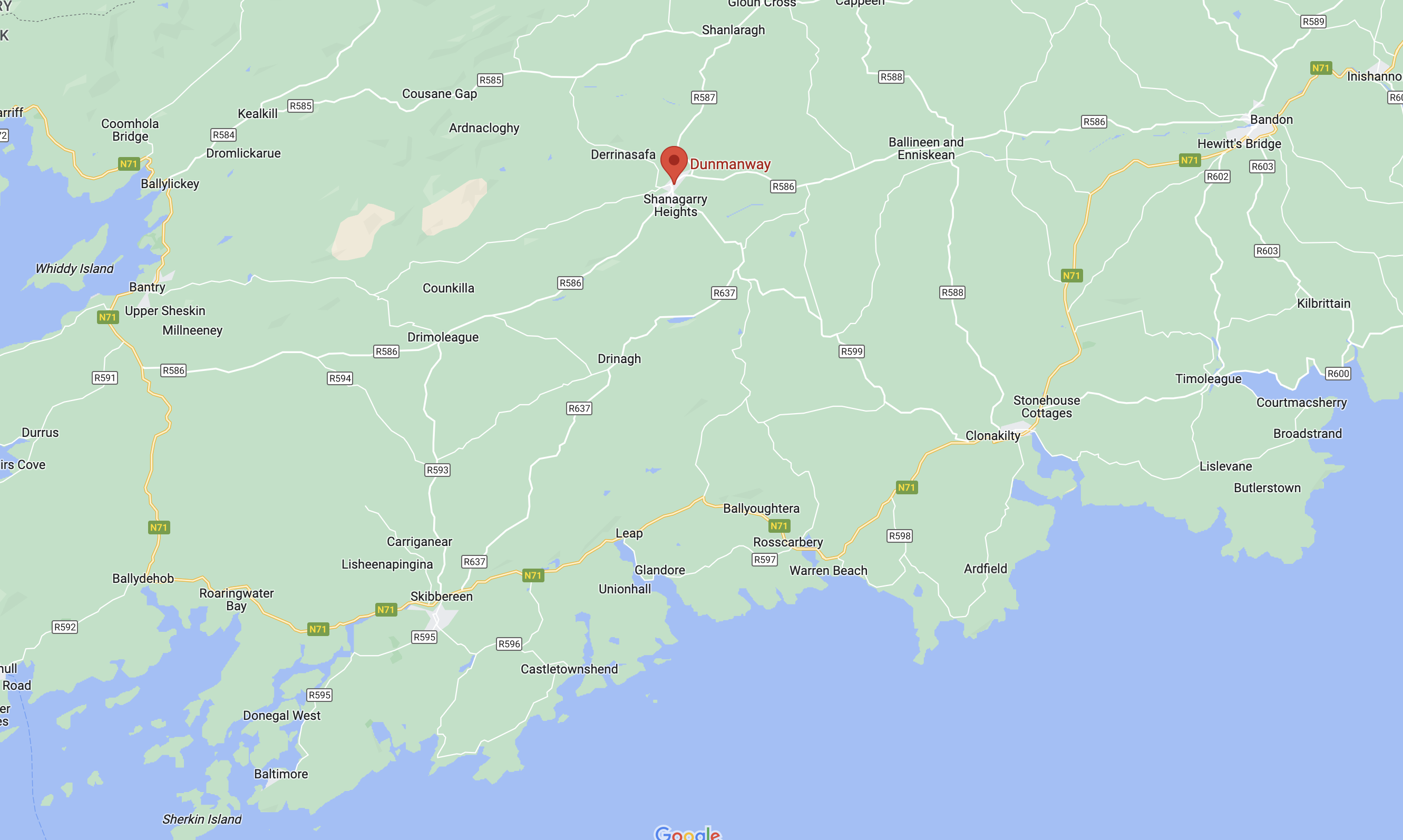 The Durrus Evanson Landlord family had 2 estates one from about 1745 of the townlands of Ardogeena, Dromreagh and Murreagh held in fee simple. The other the one time lands of the McCarthy (Mucklagh of Gearhaameen Castle) family whose lands were forfeit for ‘Rebellion’ acquired about 1690 from Crottees to Kealtaies sold to Francis Bernard of Bandon about 1715 and leased back. On the death of the Rev. Alleyn Evanson in 1853 these lands reverted to the Earl of Bandon.