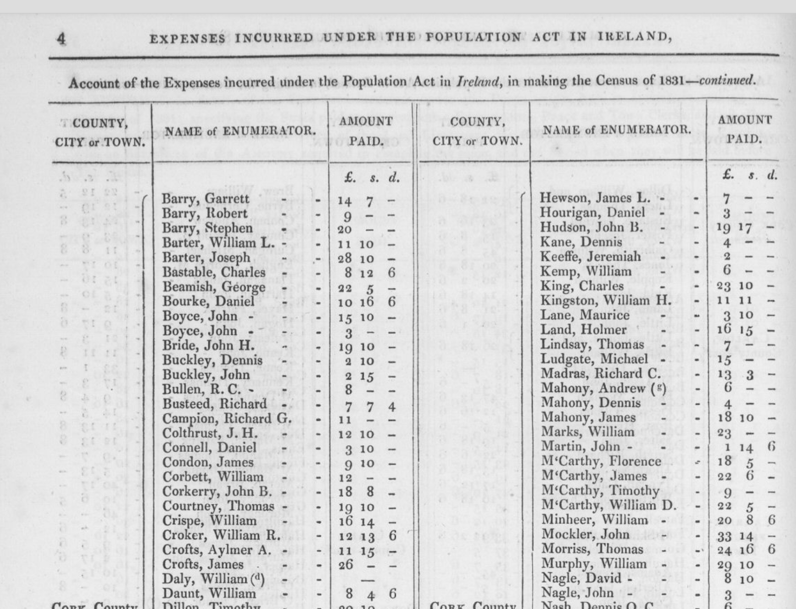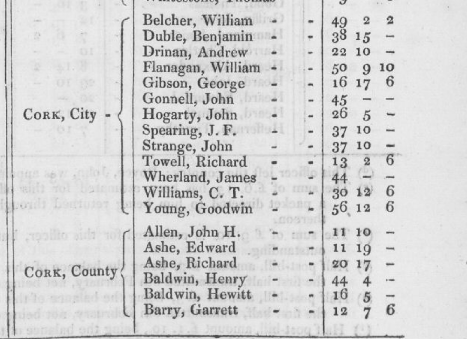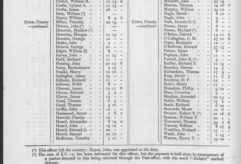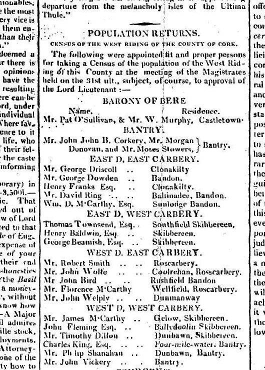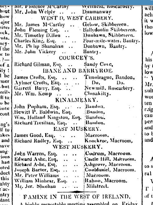 Timothy O’Donovan (1790-1874), 1818, O’Donovan’s Cove, in ruins 1875, Durrus, listed 1823, son of Richard Esq. and Jane d Alexander O’Donovan, Squince. 1820. Memorial to Lord Lieutenant William Swanton, Gortnagrough, Ballydehob, West Cork. High Constable (Rate and Tax Collector), Barony of West Carbery For Relief on Losses Caused to Him in Banking Collapse when He had transmitted Due Amount to Co. Treasurer, Leslies, Stephen and Roches Bank, Supported by Lord Bantry and Magistrates Timothy O’Donovan (Durrus), William Hull (Schull), Richard Townsend (Skibbereen), Rev. Edward Jones Alcock (Durrus), Nathaniel Evanson (Durrus), Robert Kenny (Bantry). In 1823 he applied for relief of the poor of Ballydehob, which he had founded. Present at enquiry Skibbereen 1823 into enquiry into fatal affray at Castlehaven caused by Rev. Morritt’s tithe extraction. Correspondent with Antiquarian Dr. John O’Donovan re O’Donovans of Carbery. Brother of Dr O’Donovan and Richard O’Donovan J.P. and uncle of Richard O’Donovan J.P.. His son’s wife is the granddaughter of Daniel O’Connell, the mother of his wife was Miss Lavellan, Co. Limerick, a daughter of Philip Lavellin of Water Park, Carrigaline. in the Co. of Cork. Her sister was married to Mr. Puxley of Dunboy Branch. The grandson the present (1860) Mr. Puxley is a man of immense wealth and the principal owner of the famous Allihies Mines in the Barony of Bere. Signed public declaration in Skibbereen to Alexander O’Driscoll on his removal as Magistrate 1835 with Lord Bantry, Simon White, John Puxley, Arthur Hutchins, Thomas Baldwin, Samuel Townsend Junior and Senior, Thomas Somerville, Richard Townsend Senior, Rev. Alleyn Evanson, Richard Townsend, Lyttleton Lyster. 1835 Subscriber Lewis Topographical Dictionary of Ireland 1837. In 1838 in the Liberal interest where at Bantry voter registration 15 were registered as opposed to 6 ‘Orangemen’ the tenants of Timothy O’Donovan J.P. were chiefly among those who registered. Among these were probably McCarthys of Tulig later prominent in Nationalist politics of whom John McCarthy (1859-1931) became a leading politician in Nebraska and wrote a poem in praise of Timothy O’Donovan. Attended Great Meeting in Bantry 1840 re Poor Laws. Chaired 1846 distress meeting Bantry on the proposition of Father Michael Barry PP Bantry. Landlord and political organiser. Member Election Committee, Rickard Deasy, Clonakilty (later Attorney General) 1855 Member election committee McCarthy Downing, Skibbereen. 1857 Vice Chairman of Bantry Union. Juror Cork Spring Assizes 1863. Land record, 1870, Kate O’Donovan, O’Donovan’s Cove, 1,940 acres and Reps Timothy O’Donovan 1,940 acres. 1874, Death at 85 of Timothy O’Donovan, J.P., Esq, O’Donovan Cove, Durrus, West Cork, The Last Survivor of the Ancient House of O’Donovan Bawn or Clann Cahill, Justice of the Peace since 1818 Probate to daughter Mrs Anne Barry, widow, effects £2,000, attended 8, Grand Jury Presentments