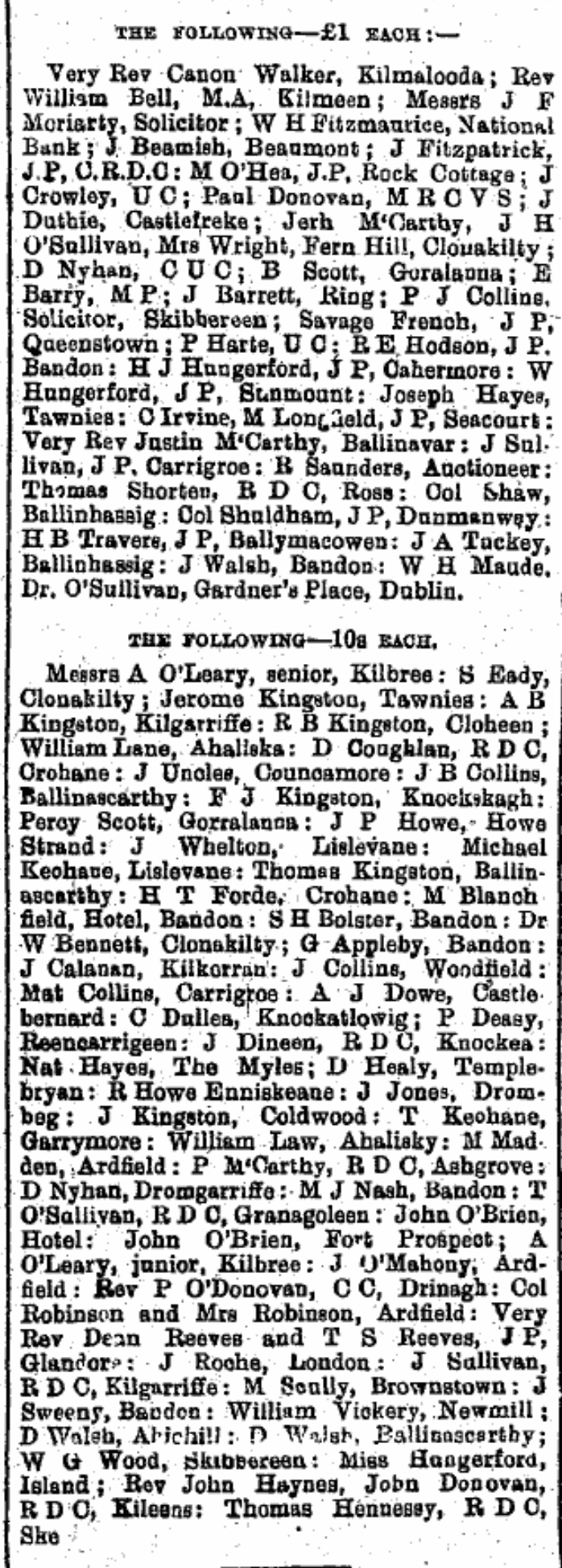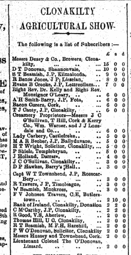 Henry Wintrop ‘The O’Donovan’ (1812-1890), TCD, MA, DL. Pre 1910, Clann Cathal, Lis Ard, Skibbereen, son Rev. Morgan, Cork ed Dr. Coughlan, m Amelia d ‘The O’Grady’, Courcy O’Grady, Kilbollyowne, Co.Limerick. Son Colonel Morgan William MA, J.P., ‘The O’Donovan’ and Alicia Jones. 1864 Cattle Show West Carbery Agricultural Society, Lissard, Skibbereen held in his grounds. Attending 17 Grand Jury presentments. Supporter Nicholas Leader, Conservative, 1865 County Cork Election. Interest in antiquities. Donor to the church bell fund, 1869, St. Nicholas, Cork. (Cork Daily Southern Reporter 26th March 1869). 1884, signed a protest against the dismissal of Lord Rossmore, head of Orange Order, Monaghan. Probate to Morgan O’Donovan, Lissard, Bishop Gregg, Cork, John Carson, Fellow Trinity College Dublin, £30,292.