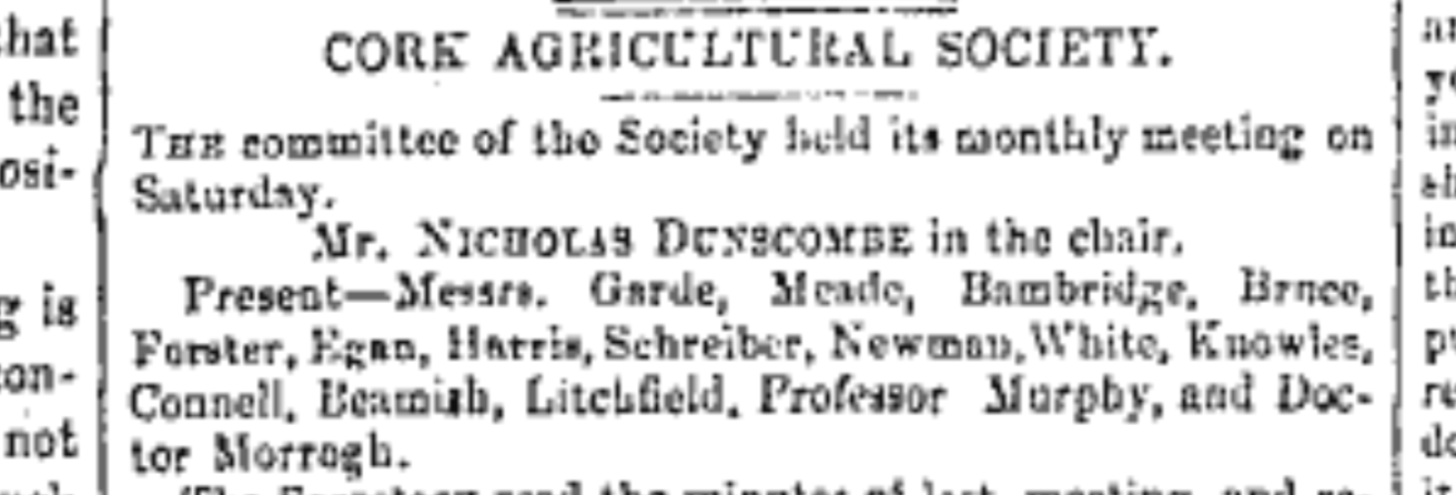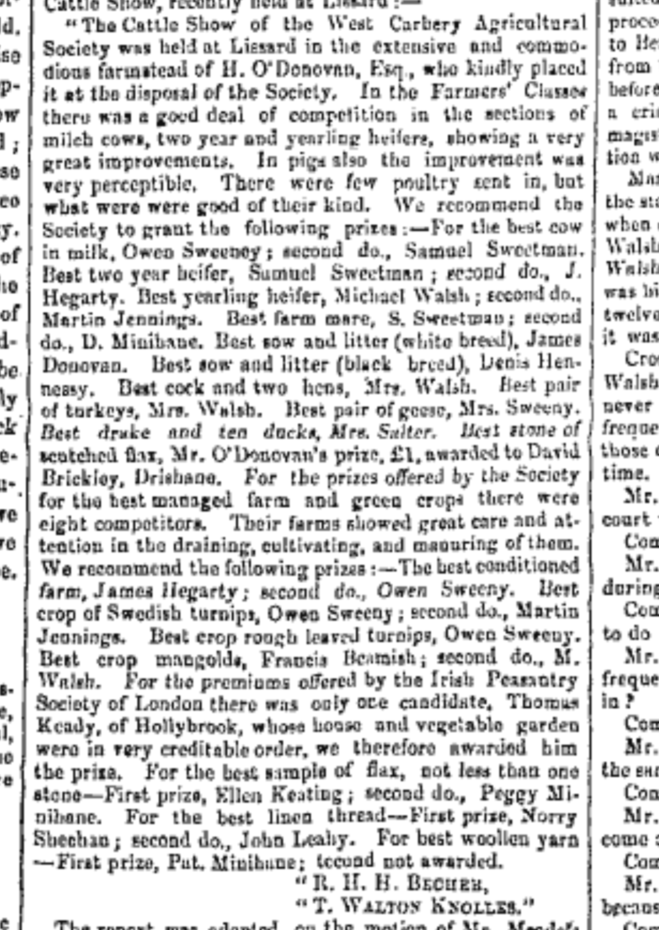 Richard Henry Hedges Beecher Esq., (1799-1882), Pre 1838, listed 1838, Hollybrook, Skibbereen, sitting Skibbereen, 1835, Came into possession pre 1833 very neglected set about improving. In re organising compensated tenants according to Ulster Custom. Engaged in road building. Abolished rundale system. Grand Jury Presentment Sessions Schull, 1834. Subscriber Lewis Topographical Dictionary of Ireland 1837. Attending Protestant Conservative Society meeting 1832. Bandon Brunswick Constitutional Club 1828. Non resident Freeman voting in Cork 1837 election. Attending Dunmanway Conservative and anti Repeal Meeting 1845. 1845 promoter Bandon to Bantry Railway. 1843 Freemason, Skibbereen. Anti-Repeal Meeting, Dunmanway 1845. Skibbereen 1847 distress meeting. Presentment sessions Ballydehob 1845. Signed ‘No Popery Petition 1851’. 1866 Freemason Skibbereen 15th Lodge. Long litigation with Lord Bandon added to financial woes over the townland of Rathooragh near Mount Gabriel. Imprisoned but later freed by his creditors 1848. The Hollybrook estate was sold in the Encumbered Estates Court in 1851, 17,000 acres, 42 townlands, 8 parishes, debts in 52 charges amounting to £52,275. The sale realised £52,080. It was estimated that the rent of £4,500 per annum represents only 25% of the value of market rents but two thirds were given long leases on low rents with a capital sum in 1794 to families such as the Ballydehob Swantons. 1839 Freeman’s Journal 15 Feb 1839 “Marriages~On Tuesday last, in Cork, Richard H H Becher, Esq of Hollybrook in that Co., to Melian, daughter of the Rev Morgan O’Donovan of Montpelier (Ronayne’s Court, Douglas, Cork). Freeman of Cork. Melian, daughter of the Rev Morgan O’Donovan of Montpelier (Ronayne’s Court, Douglas, Cork). Freeman of Cork. He became the O’Donovan as did his son Henry Winthrop. 1864 officiated Cattle Show West Carbery Agricultural Society, Lissard, Skibbereen. He became the O’Donovan as did his son Henry Winthrop. Niece Susan Emily Becher Hungerford, informant of death, probate to Richard Becher Hungerford, £217.