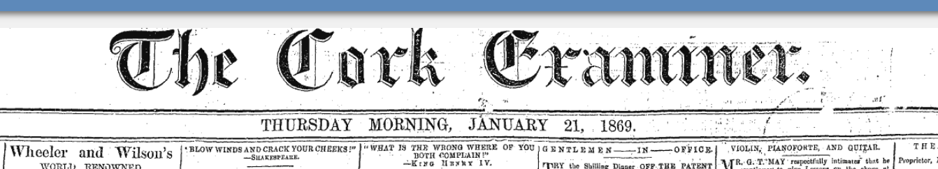 Henry Wintrop ‘The O’Donovan’ (1812-1890), TCD, MA, DL. Pre 1910, Clann Cathal, Lis Ard, Skibbereen, son Rev. Morgan, Cork ed Dr. Coughlan, m Amelia d ‘The O’Grady’, Courcy O’Grady, Kilbollyowne, Co.Limerick. Son Colonel Morgan William MA, J.P., ‘The O’Donovan’ and Alicia Jones. 1869 Public Appeal for Mr. Patrick Walsh, Skibbereen and His Family Whose Flax Mill Destroyed by Fire. His Landlord The O’Donovan had Encouraged him., 1864 Cattle Show West Carbery Agricultural Society, Lissard, Skibbereen held in his grounds. Attending 17 Grand Jury presentments. Supporter Nicholas Leader, Conservative, 1865 County Cork Election. Interest in antiquities. Donor to the church bell fund, 1869, St. Nicholas, Cork. (Cork Daily Southern Reporter 26th March 1869). 1884, signed a protest against the dismissal of Lord Rossmore, head of Orange Order, Monaghan. Probate to Morgan O’Donovan, Lissard, Bishop Gregg, Cork, John Carson, Fellow Trinity College Dublin, £30,292.