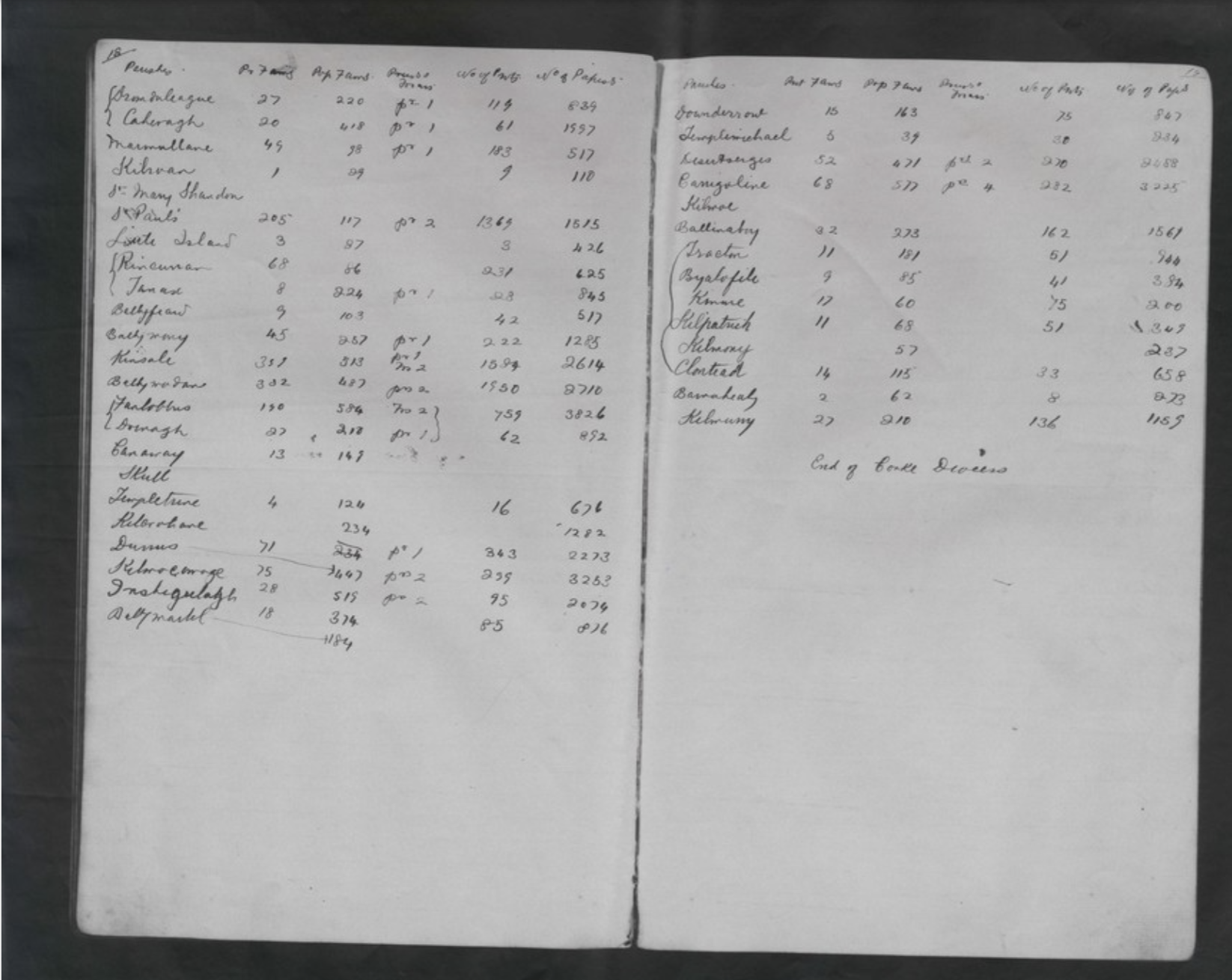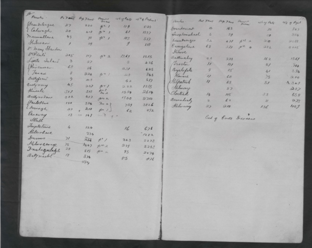 Kilcrohane and Durrus, 71 Protestant households, and 343 Protestant individuals; 681 Catholic households, and 3,555 Catholic individuals.