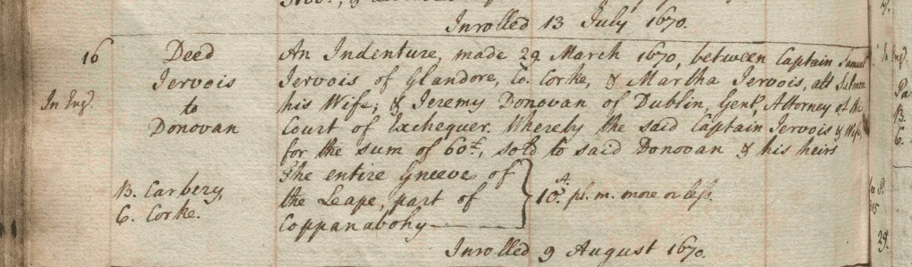 670 Indenture Captain Samuel Jervois and His Wife sell for £60 the entire Gneeve (Old land measurement a twelfth part of a townland which can vary in size.: https://www.dippam.ac.uk/eppi/documents/11941/page/282490 ) of Leap parrt of Cappanabohy