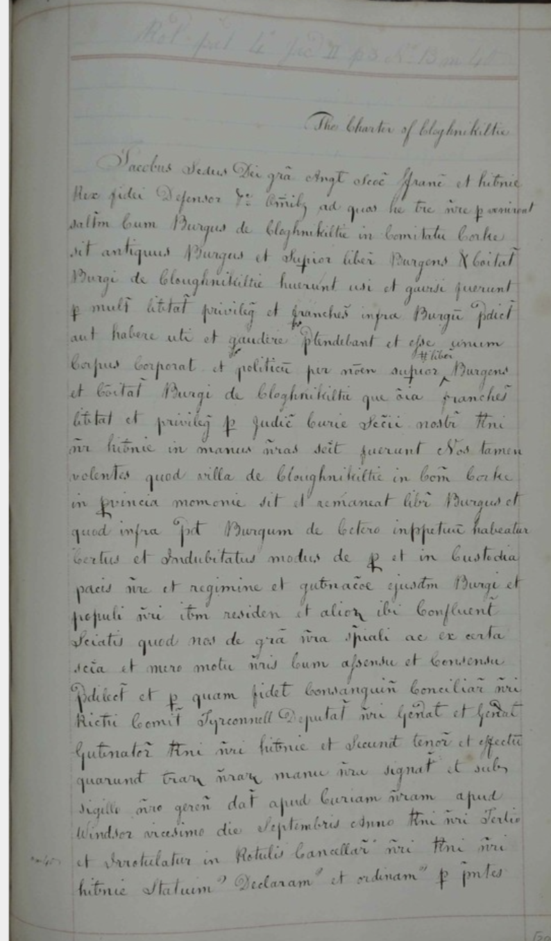 Original charter for the existing town of Clonakilty, County Cork, issued from Hampton Court, to become a borough and appointing Nicholas Barham as first sovereign. The burgesses appointed were Andrew Kettleby, Stephen Coveney, Humphrey Jobson, Edward Bradston, Richard Drew, Nicholas Drew, Thomas Edgecombe (clothier), Abraham Bates, Nicholson, Thomas Harris, Richard Hullet (clothier), Ambrose Hullet (clothier), Richard Ussher (clothier), John Phillips (merchant), John Blake (merchant), Nathaniel Bennet (butcher), Thomas Asden (butcher), Humphrey Fisher (tailor), Theodore Jacob (innkeeper), John Williams (shoemaker), John Harison (mason), John Ward (carpenter), Nicholas Tuxberry (joiner) and Thomas Bartlett (surgeon). Sir Richard Boyle, Lord of the Town, given power to appoint the first three burgesses and administer the oath of Supremacy