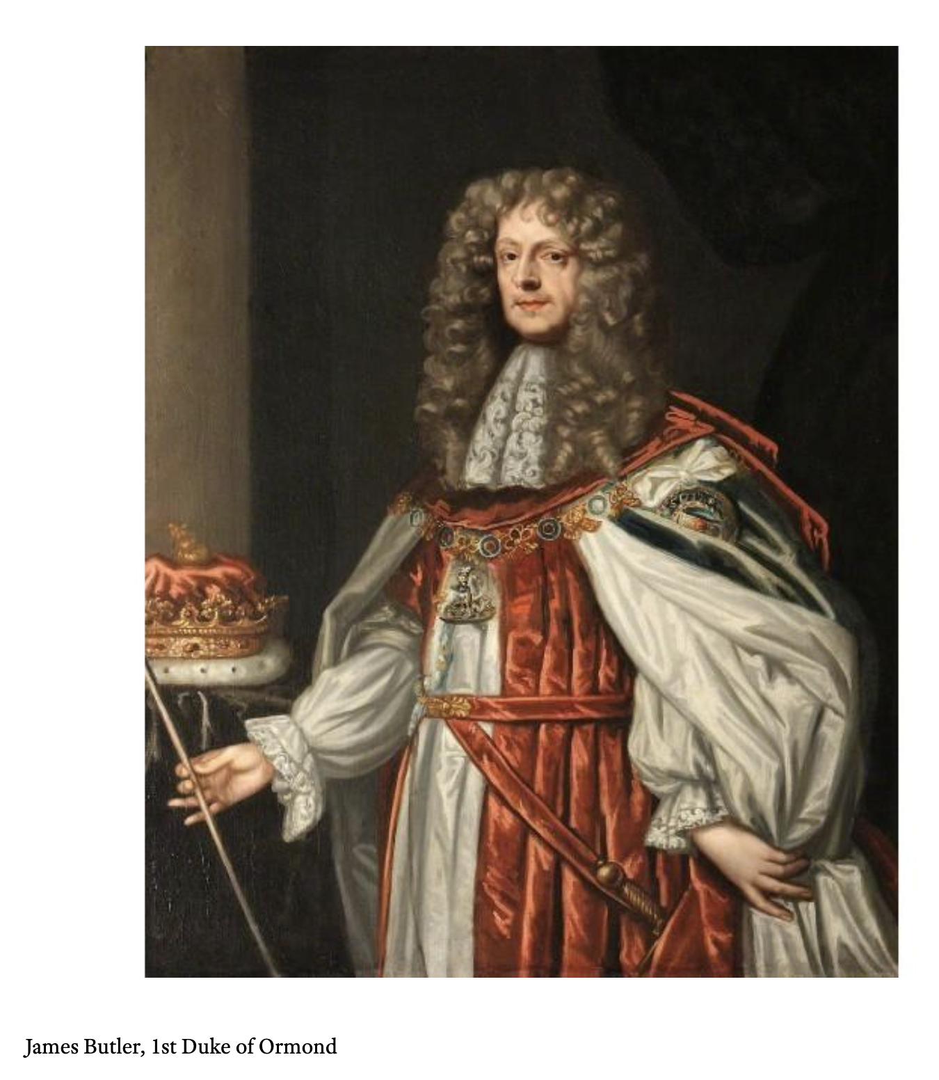 Butler, James (1610–88), 12th earl and 1st duke of Ormond, was born 19 October 1610 at Clerkenwell, Middlesex, England, eldest son of Thomas Butler, Viscount Thurles , and his wife Elizabeth, daughter of Sir John Poyntz, of Iron Acton, Gloucestershire. Thurles was son and heir to Walter Butler (qv), 11th earl, who succeeded to the title in 1614 on the death of his uncle, Thomas (qv), 10th earl, whose one surviving child was a daughter, Elizabeth (qv). The viscount took his family to Ireland, but when returning from a visit to England was shipwrecked and drowned on 15 December 1619, leaving the 9-year-old James as the direct heir to the title. His widow Elizabeth married (a.15 June 1626) George Mathew of Thurles, Co. Tipperary, by whom she had a second family. Youth and marriage The details of James Butler’s youth are mainly derived from Sir Robert Southwell (qv), who presented a brief and laudatory life of the duke to his grandson and successor two months after the first duke’s death. According to Southwell, on his father’s death, Butler’s mother placed him in a school in Finchley to be raised in the Roman catholic faith, to which both parents were committed. However, through the manipulation of the law, James I claimed the young heir as a royal ward and in 1622 put him in the care of George Abbot, archbishop of Canterbury, under whose tutelage he received a protestant upbringing. The religious part of his education made a deep impression on the boy, but in other respects Abbot made little effort to educate his charge, and it was only the intervention of the grandfather that ensured some facility in writing, French, and Irish. His Latin was almost entirely neglected.