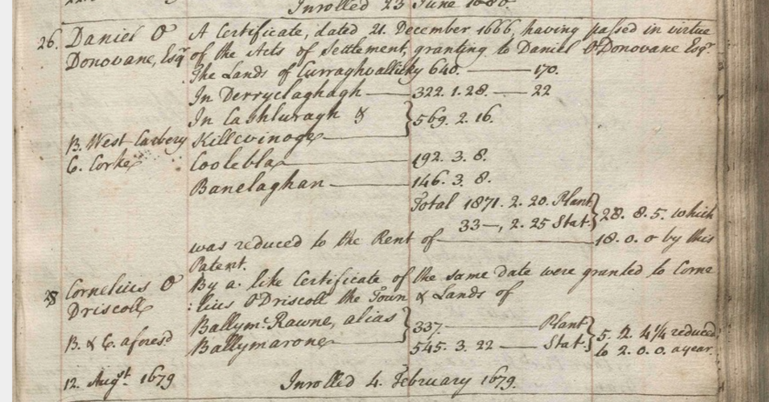 Obtaining letters patent from Charles II, his extensive landholdings were erected into the manor of O’Donovan’s Leap, or the Manor of the Leap, in 1684.