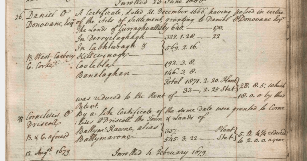 Court of Pie Powder Reserved to Donnell O’Donovan for Fairs, Ascension Thursday and Townlands Listed from Castledonovan to Castlehaven, Caheragh, Glandore, Squince, Brahalish in Durrus. Manor of Castledonovan Power to Hold Court of Leet and Baron, Friday Market at Rahine, Tuesday market at Drimoleague.