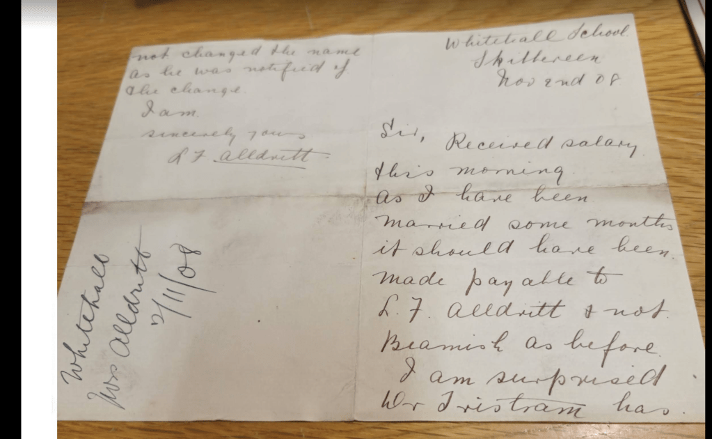 Aughadown (Erasmus Smith) School. 1866 Invoice From John Copithorme, Skibbereen for School Supplies. School Closure 1885 for Outbreak of Scarlatina. 1909 Letter from Mrs. Alldritt teacher (Nee Elizabeth Frances Beamish, Dunmanway) seeking payment of her Salary to her Husband.
