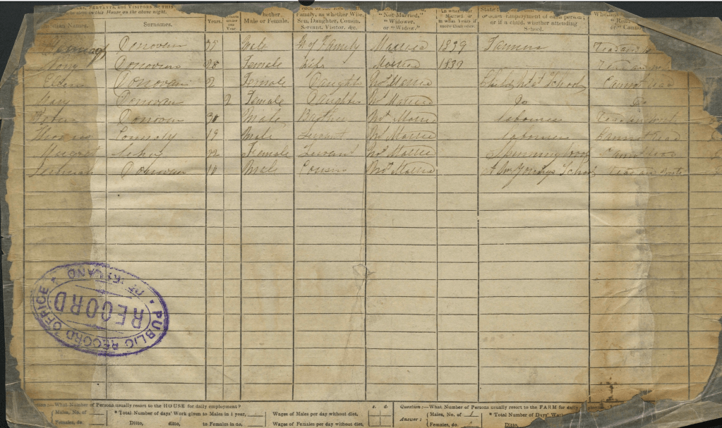 Damaged, 1841 census form (number 37) for Donovan family, unknown townland, Dromdaleague parish, West Carbery, East Division, County Cork.