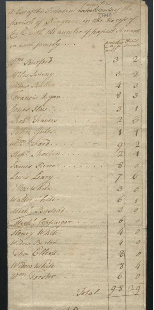The census provided a list of the names of householders in the parish. For Protestant householders the number of Protestants and ‘Papist servants’ was provided; for Catholic householders ‘the number of persons in each family’ was given.