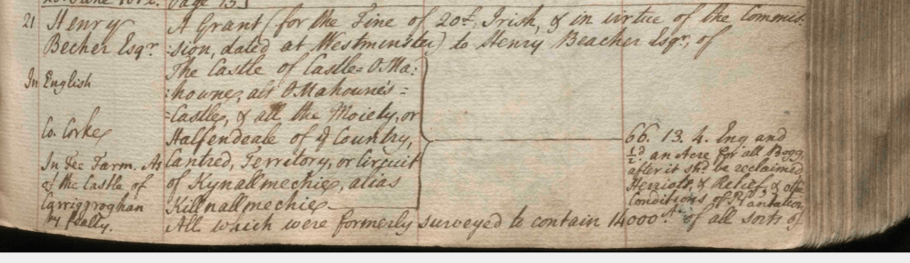 Henry Beecher, (1759-1780), 1779, Creagh/Creaford, Skibbereen. 1765 11 July Cork City Newspapers. “To be Let, part of the estate of Henry Becher (aged 5) during his minority. Lands of Gortadrohid, Ardnagreena on harbour of Baltimore etc. contact Michael Becher guardian. 1779 Hibernian Magazine Dec 1779 “Henry Becher of Creaghtford to be a J.P. of the Peace for the Co of Cork”. 1780 Hibernian Chronicle 25 Dec 1780 “Died Thursday last, Henry Becher at Creagh near Baltimore.” The guardian Michael Henry Becher [1735-1778 was his uncle & my 4 x Great Grandfather. He was married to Catherine French. Poor Henry is the one who died after a shooting accident on his 21st birthday.