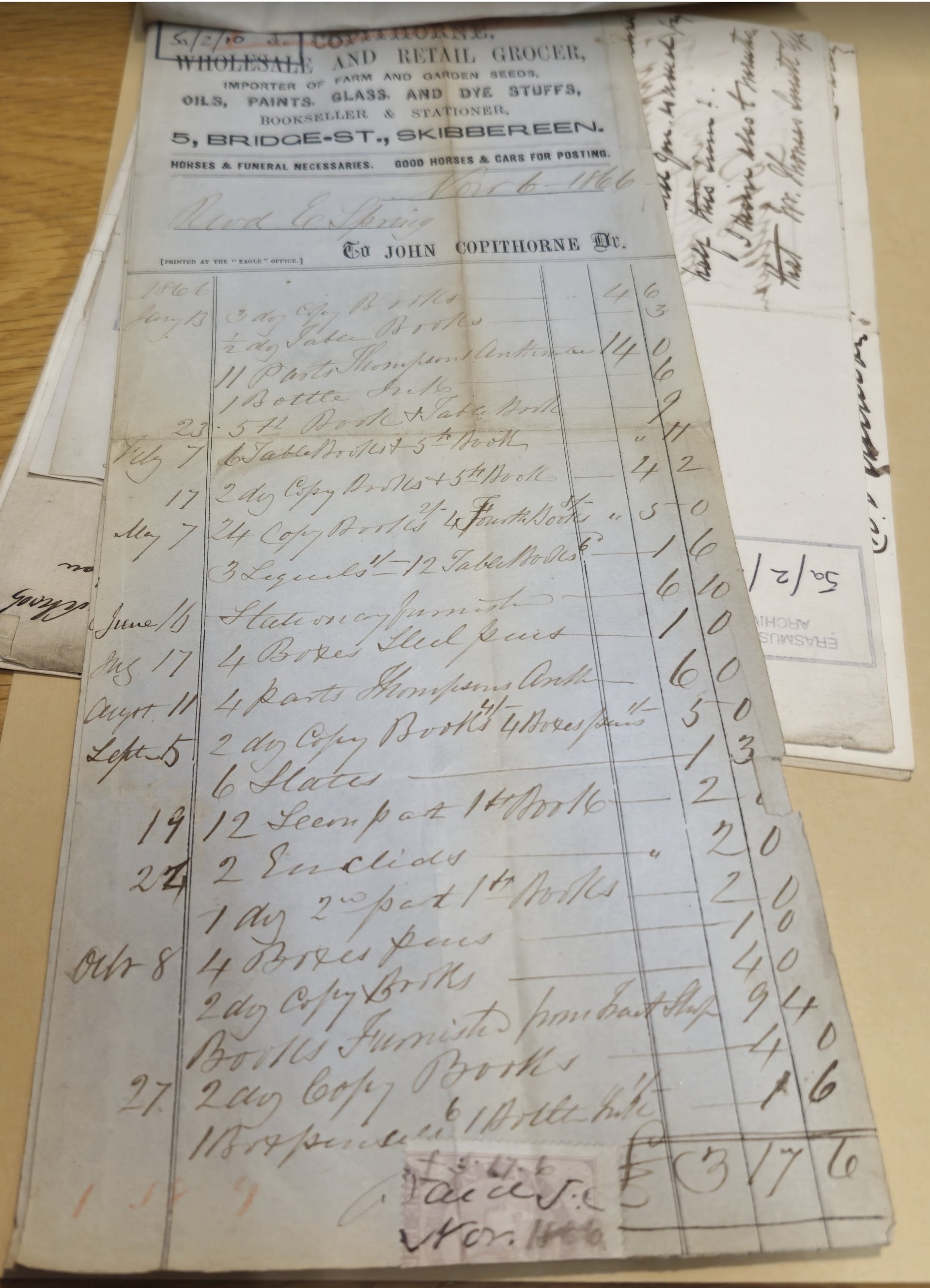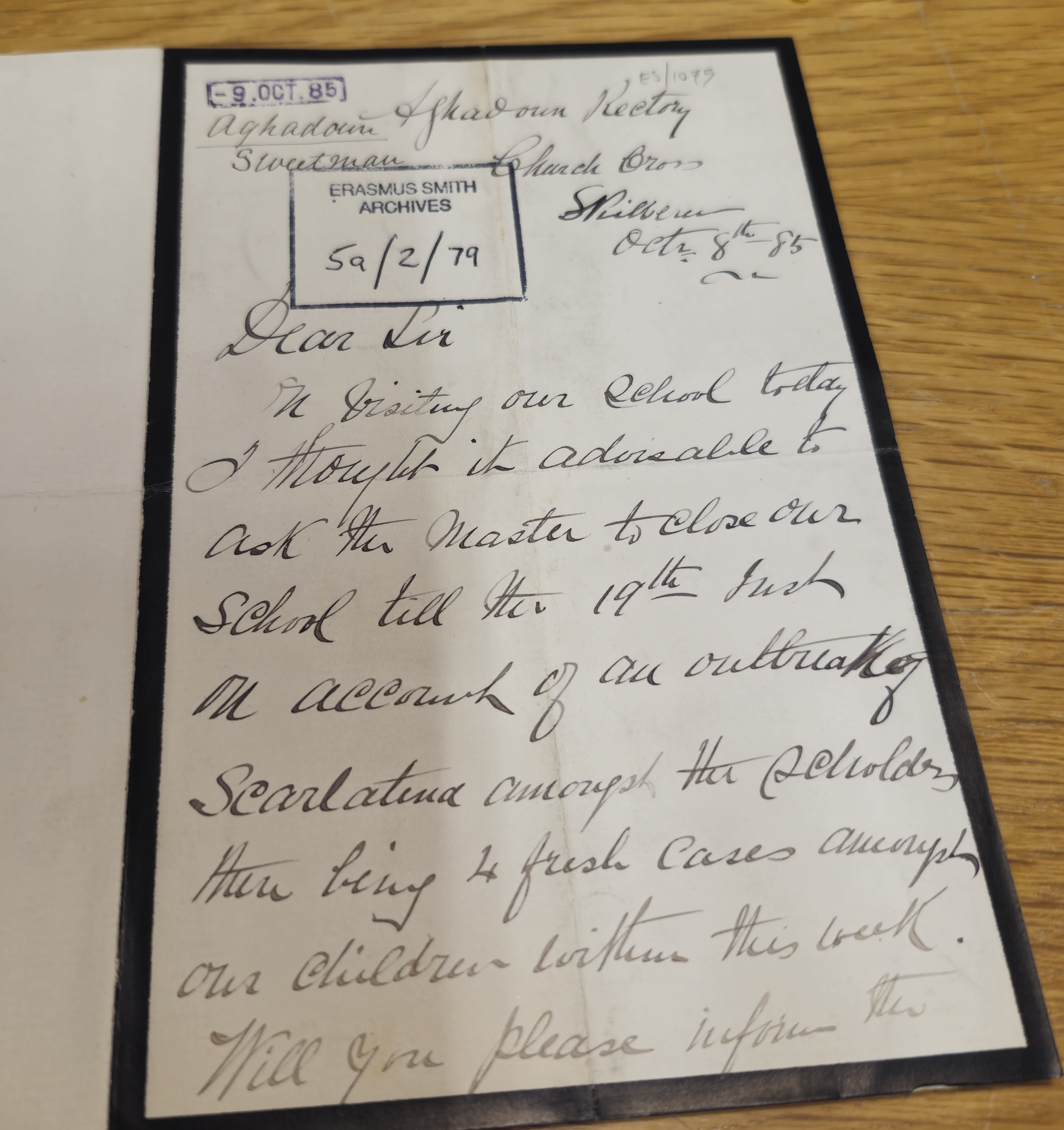 Aughadown (Erasmus Smith) School. 1866 Invoice From John Copithorme, Skibbereen for School Supplies. School Closure 1885 for Outbreak of Scarlatina. 1909 Letter from Mrs. Alldritt teacher (Nee Elizabeth Frances Beamish, Dunmanway) seeking payment of her Salary to her Husband.