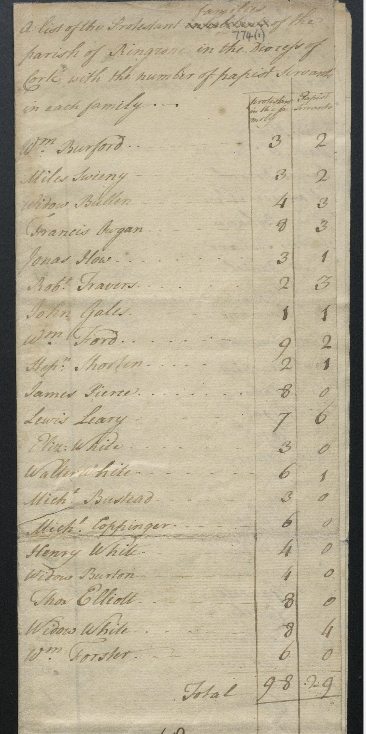 The census provided a list of the names of householders in the parish. For Protestant householders the number of Protestants and ‘Papist servants’ was provided; for Catholic householders ‘the number of persons in each family’ was given.